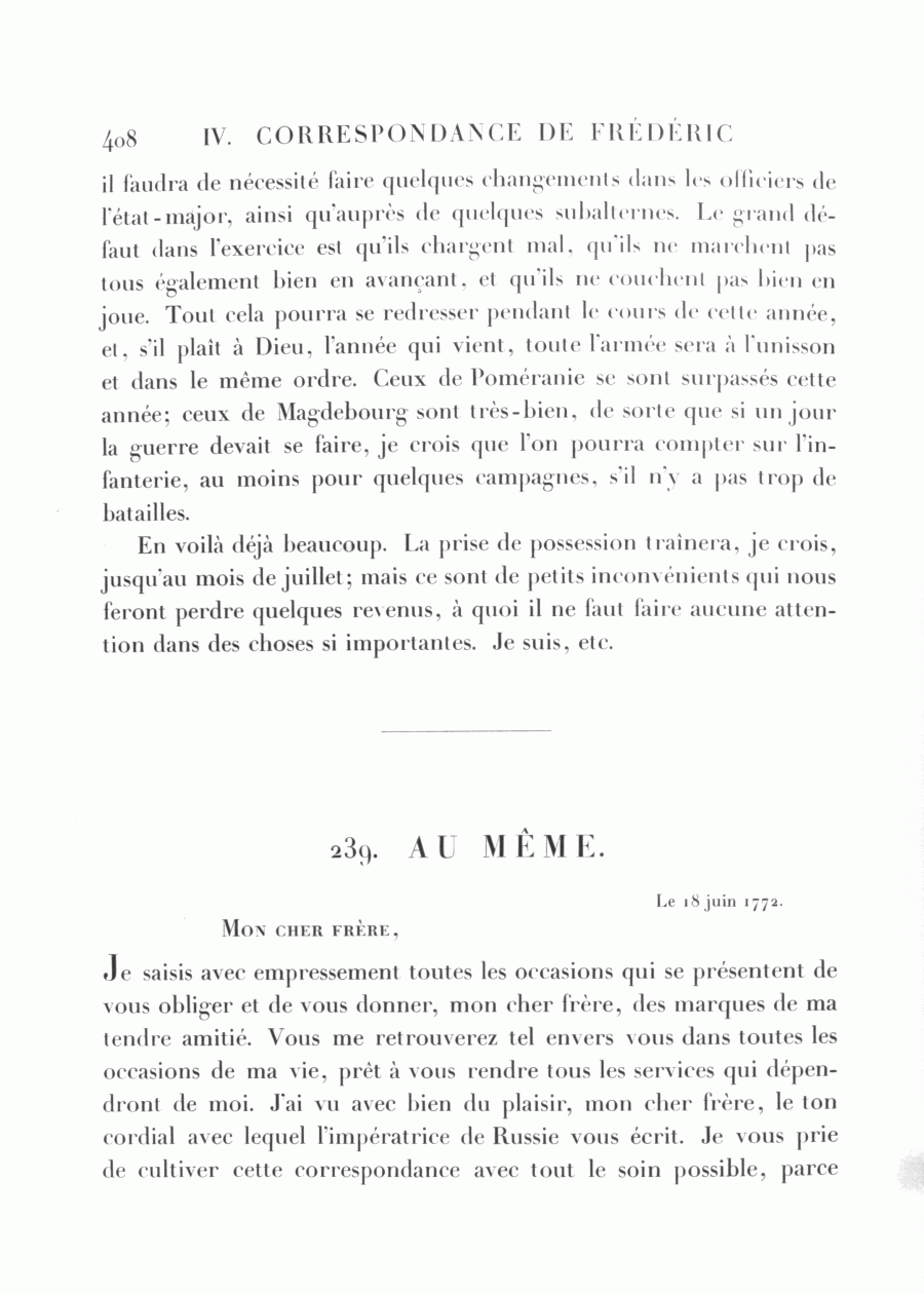 Je saisis avec empressement toutes les occasions qui se présentent de vous obliger et de vous donner, mon cher frère, des marques de ma tendre amitié. Vous me retrouverez tel envers vous dans toutes les occasions de ma vie, prêt à vous rendre tous les services qui dépendront de moi. J'ai vu avec bien du plaisir, mon cher frère, le ton cordial avec lequel l'impératrice de Russie vous écrit. Je vous prie de cultiver cette correspondance avec tout le soin possible, parce