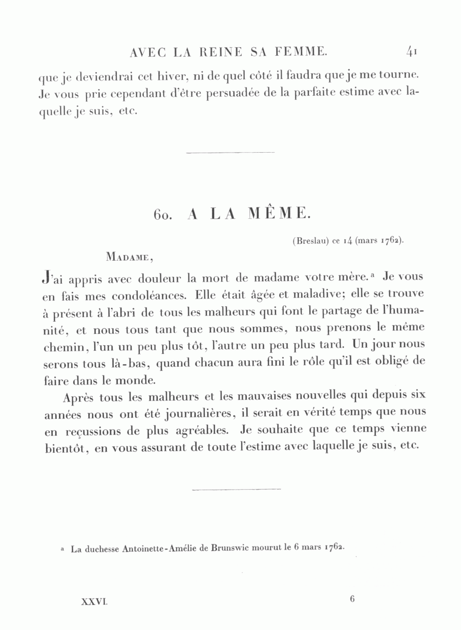 J'ai appris avec douleur la mort de madame votre mère.a Je vous en fais mes condoléances. Elle était âgée et maladive; elle se trouve à présent à l'abri de tous les malheurs qui font le partage de l'humanité, et nous tous tant que nous sommes, nous prenons le même chemin, l'un un peu plus tôt, l'autre un peu plus tard. Un jour nous serons tous là-bas, quand chacun aura fini le rôle qu'il est obligé de faire dans le monde.