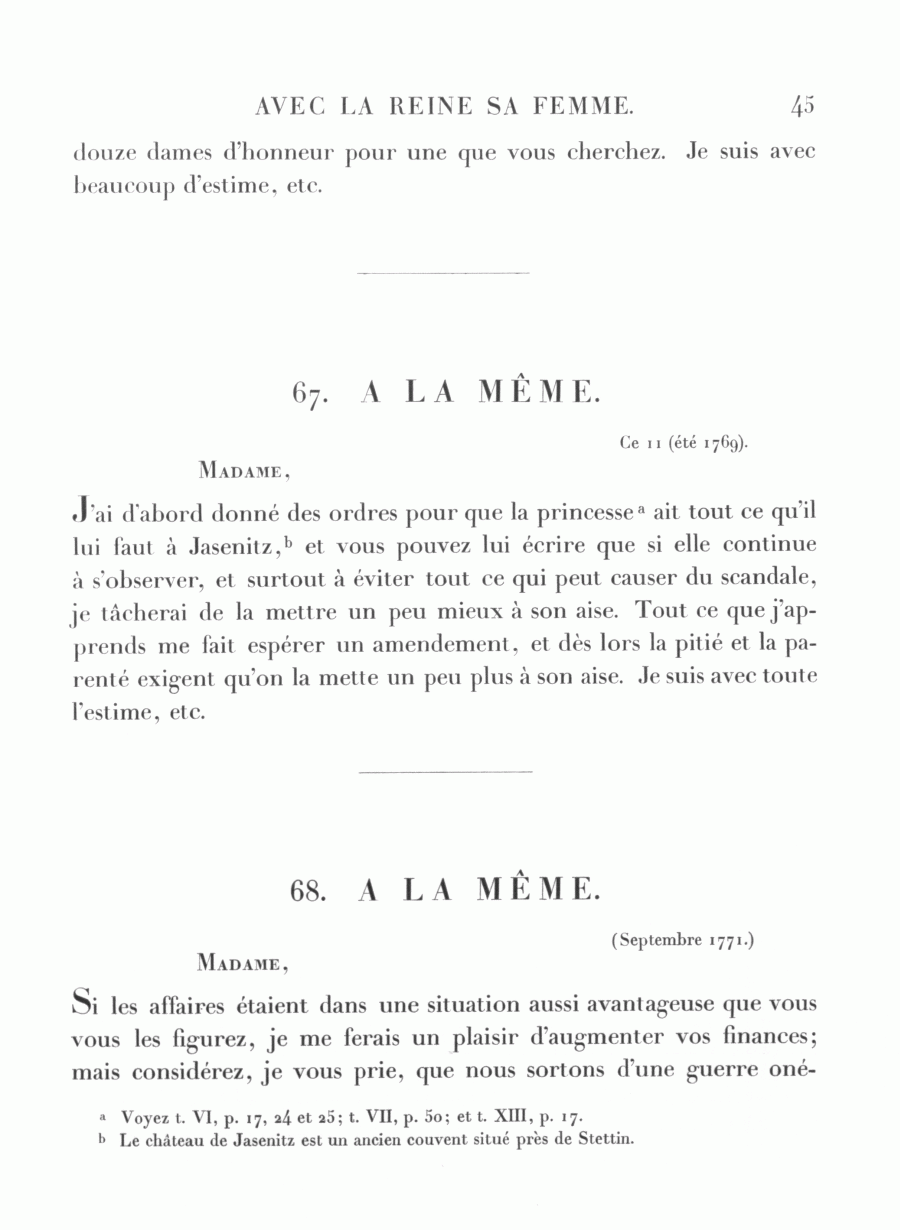 J'ai d'abord donné des ordres pour que la princessea ait tout ce qu'il lui faut à Jasenitz,b et vous pouvez lui écrire que si elle continue à s'observer, et surtout à éviter tout ce qui peut causer du scandale, je tâcherai de la mettre un peu mieux à son aise. Tout ce que j'apprends me fait espérer un amendement, et dès lors la pitié et la parenté exigent qu'on la mette un peu plus à son aise. Je suis avec toute l'estime, etc.