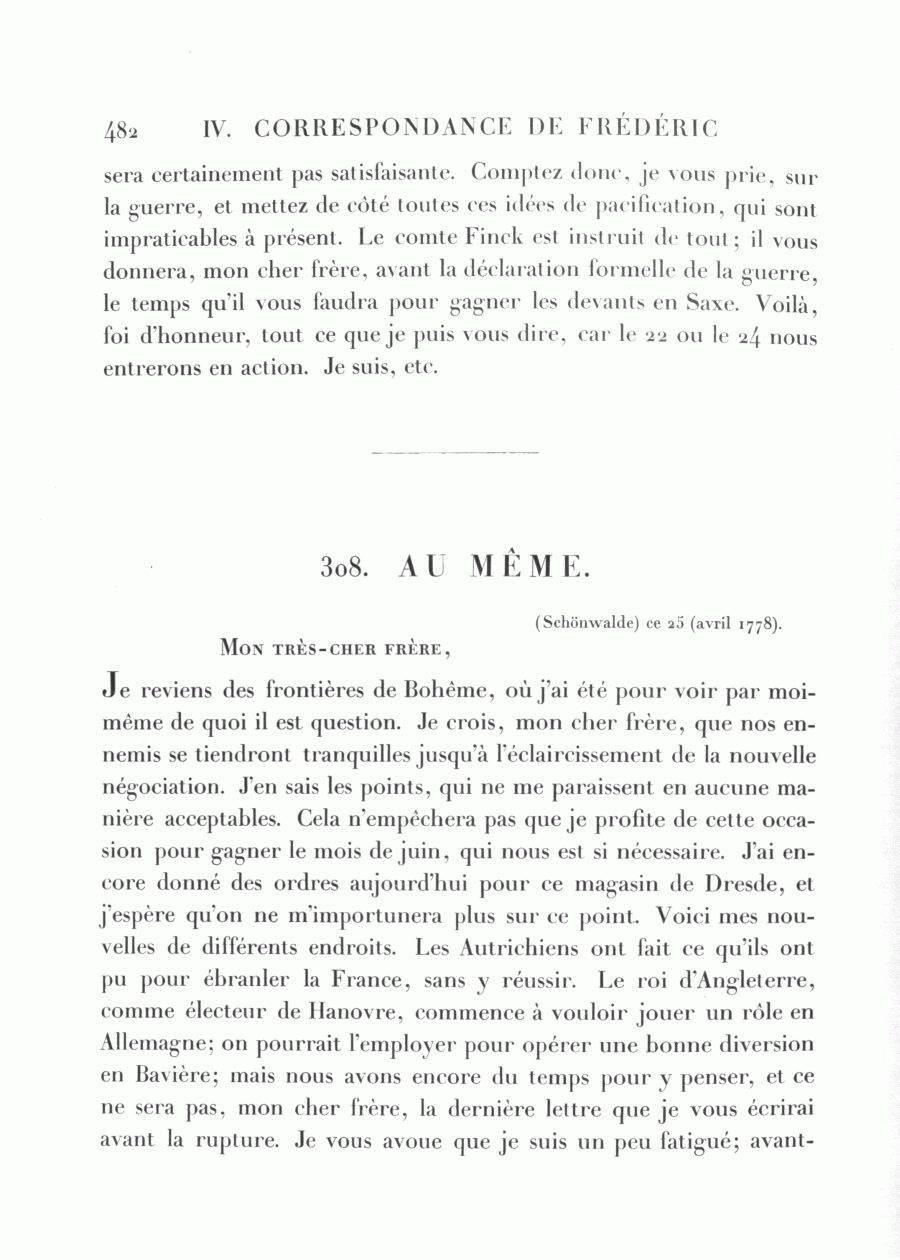 <482> sera certainement pas satisfaisante. Comptez donc, je vous prie, sur la guerre, et mettez de côté toutes ces idées de pacification, qui sont impraticables à présent. Le comte Finck est instruit de tout; il vous donnera, mon cher frère, avant la déclaration formelle de la guerre, le temps qu'il vous faudra pour gagner les devants en Saxe. Voilà, foi d'honneur, tout ce que je puis vous dire, car le 22 ou le 24 nous entrerons en action. Je suis, etc.