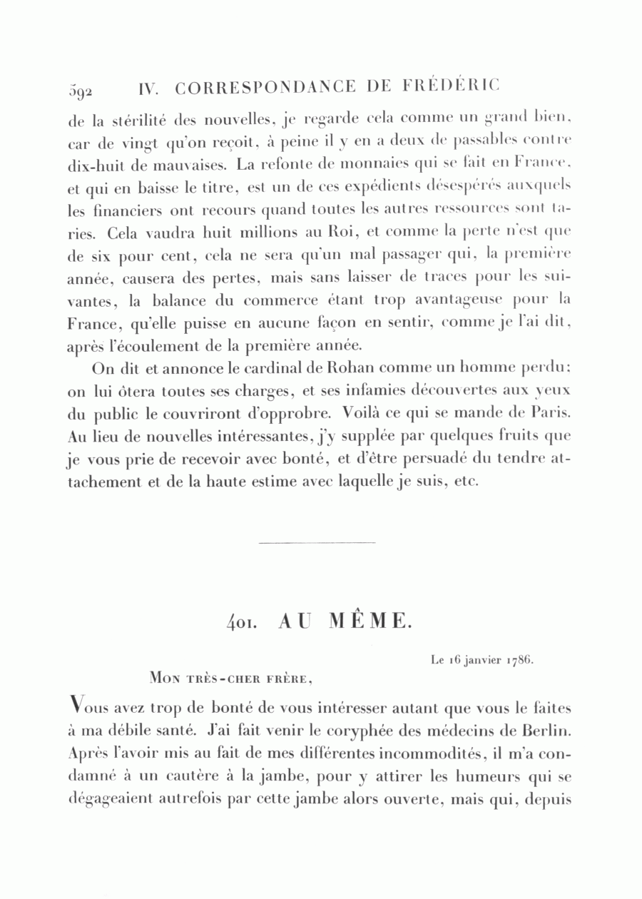 Vous avez trop de bonté de vous intéresser autant que vous le faites à ma débile santé. J'ai fait venir le coryphée des médecins de Berlin. Après l'avoir mis au fait de mes différentes incommodités, il m'a condamné à un cautère à la jambe, pour y attirer les humeurs qui se dégageaient autrefois par cette jambe alors ouverte, mais qui, depuis