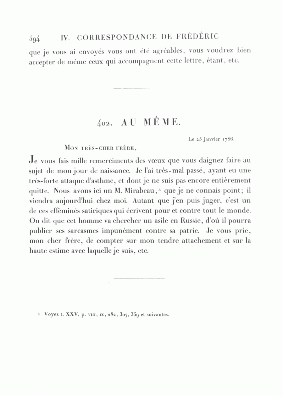 Je vous fais mille remercîments des vœux que vous daignez faire au sujet de mon jour de naissance. Je l'ai très-mal passé, ayant eu une très-forte attaque d'asthme, et dont je ne suis pas encore entièrement quitte. Nous avons ici un M. Mirabeau,a que je ne connais point; il viendra aujourd'hui chez moi. Autant que j'en puis juger, c'est un de ces efféminés satiriques qui écrivent pour et contre tout le monde. On dit que cet homme va chercher un asile en Russie, d'où il pourra publier ses sarcasmes impunément contre sa patrie. Je vous prie, mon cher frère, de compter sur mon tendre attachement et sur la haute estime avec laquelle je suis, etc.