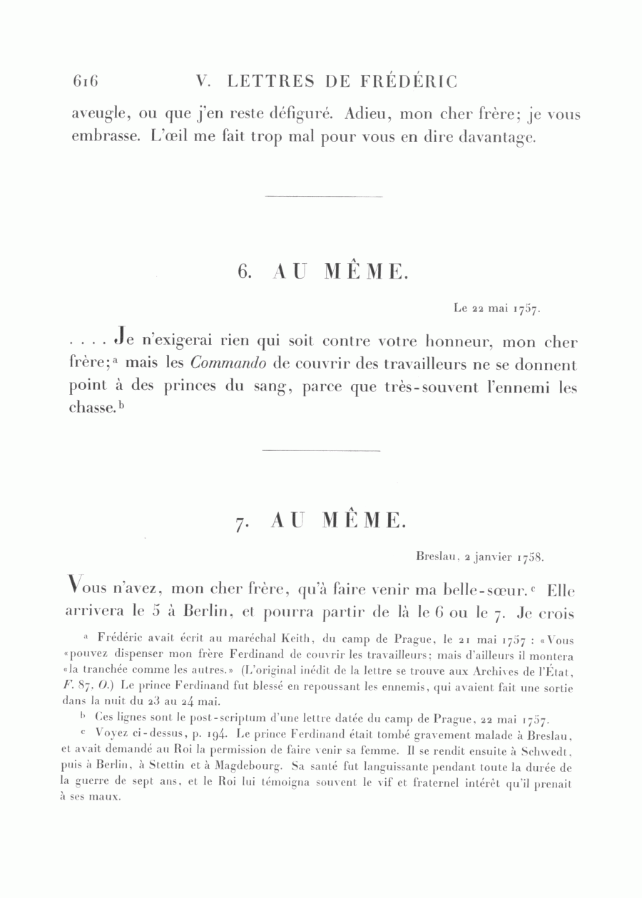 a Frédéric avait écrit au maréchal Keith, du camp de Prague, le 21 mai 1757 : « Vous pouvez dispenser mon frère Ferdinand de couvrir les travailleurs : mais d'ailleurs il montera la tranchée comme les autres. » (L'original inédit de la lettre se trouve aux Archives de l'État, F. 87. O.) Le prince Ferdinand fut blessé en repoussant les ennemis, qui avaient fait une sortie dans la nuit du 23 au 24 mai.