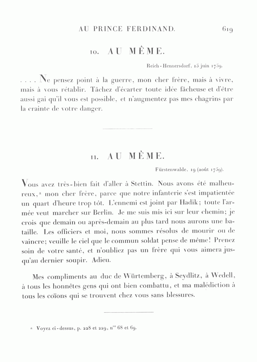 Vous avez très-bien fait daller à Stettin. Nous avons été malheureux,a mon cher frère, parce que notre infanterie s'est impatientée un quart d'heure trop tôt. L'ennemi est joint par Hadik; toute l'armée veut marcher sur Berlin. Je me suis mis ici sur leur chemin; je crois que demain ou après-demain au plus tard nous aurons une bataille. Les officiers et moi, nous sommes résolus de mourir ou de vaincre; veuille le ciel que le commun soldat pense de même! Prenez soin de votre santé, et n'oubliez pas un frère qui vous aimera jusqu'au dernier soupir. Adieu.