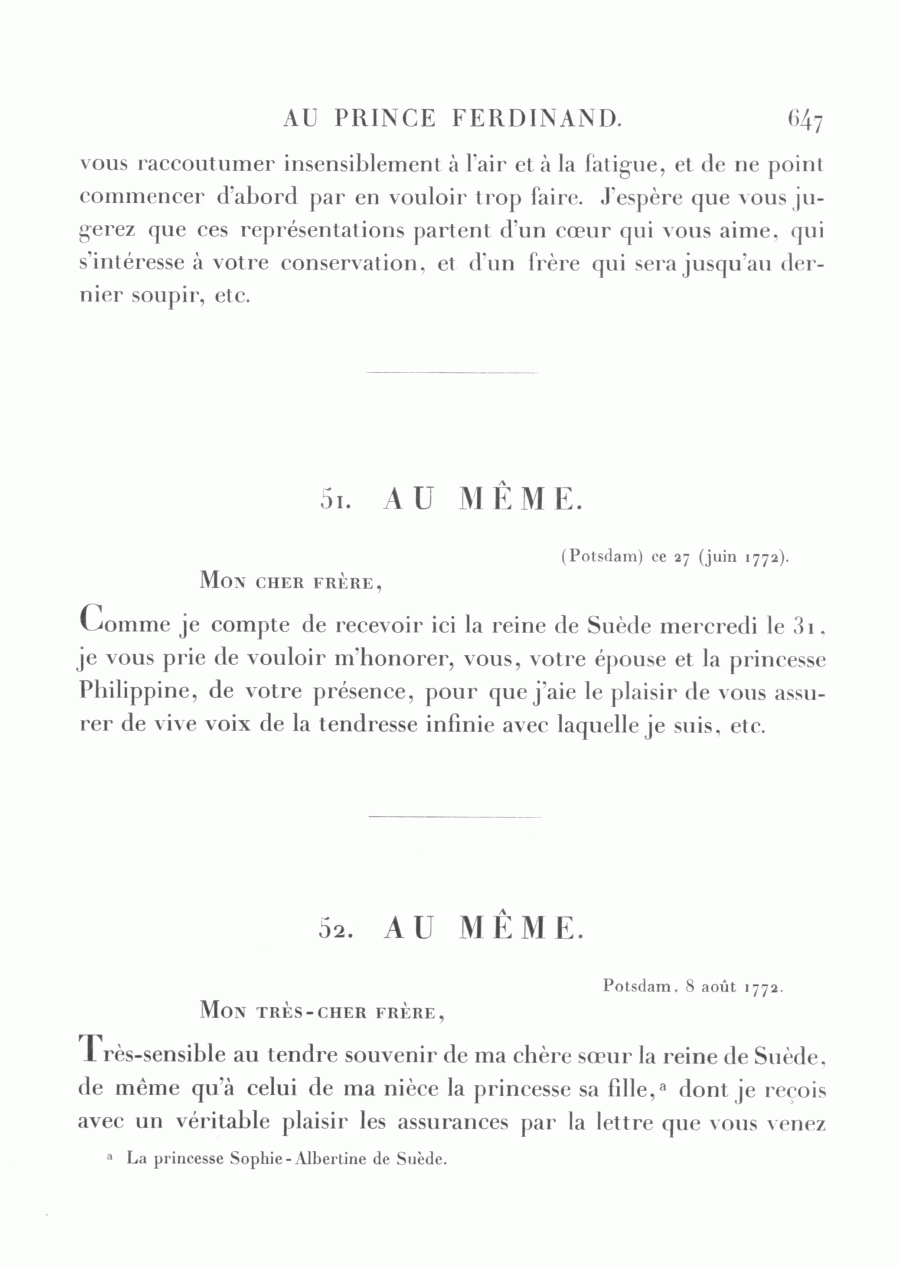 Très-sensible au tendre souvenir de ma chère sœur la reine de Suède, de même qu'à celui de ma nièce la princesse sa fille,a dont je reçois avec un véritable plaisir les assurances par la lettre que vous venez