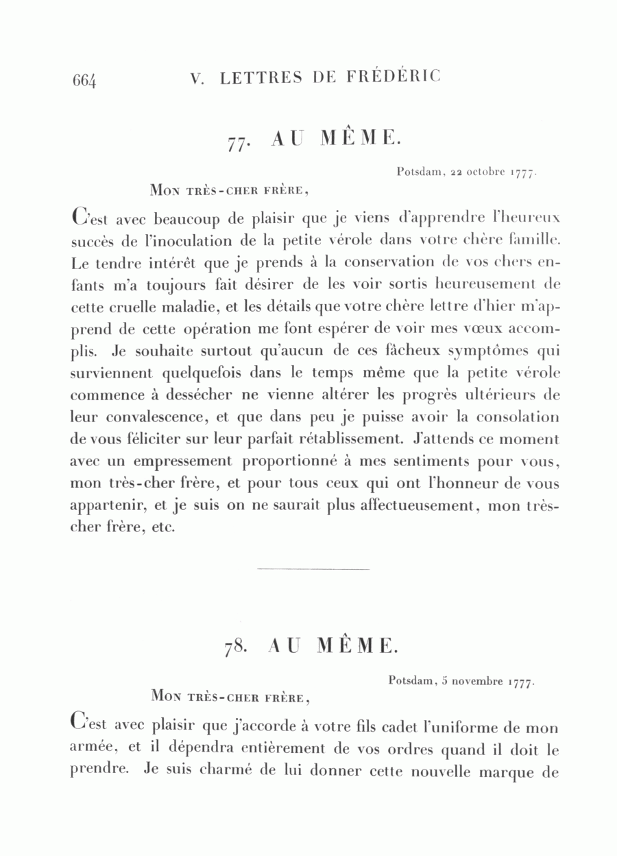 C'est avec beaucoup de plaisir que je viens d'apprendre l'heureux succès de l'inoculation de la petite vérole dans votre chère famille. Le tendre intérêt que je prends à la conservation de vos chers enfants m'a toujours fait désirer de les voir sortis heureusement de cette cruelle maladie, et les détails que votre chère lettre d'hier m'apprend de cette opération me font espérer de voir mes vœux accomplis. Je souhaite surtout qu'aucun de ces fâcheux symptômes qui surviennent quelquefois dans le temps même que la petite vérole commence à dessécher ne vienne altérer les progrès ultérieurs de leur convalescence, et que dans peu je puisse avoir la consolation de vous féliciter sur leur parfait rétablissement. J'attends ce moment avec un empressement proportionné à mes sentiments pour vous, mon très-cher frère, et pour tous ceux qui ont l'honneur de vous appartenir, et je suis on ne saurait plus affectueusement, mon très-cher frère, etc.