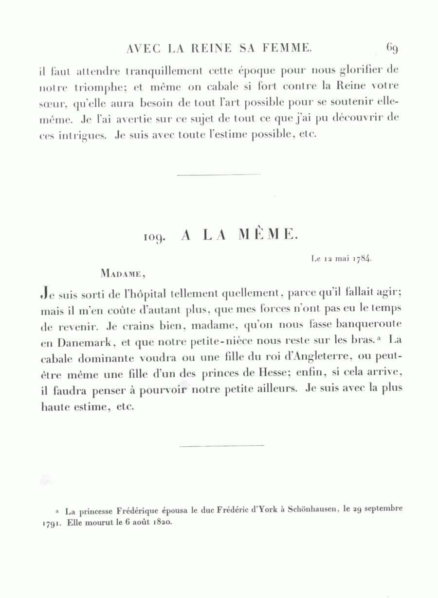 Je suis sorti de l'hôpital tellement quellement, parce qu'il fallait agir; mais il m'en coûte d'autant plus, que mes forces n'ont pas eu le temps de revenir. Je crains bien, madame, qu'on nous fasse banqueroute en Danemark, et que notre petite-nièce nous reste sur les bras.a La cabale dominante voudra ou une fille du roi d'Angleterre, ou peut-être même une fille d'un des princes de Hesse; enfin, si cela arrive, il faudra penser à pourvoir notre petite ailleurs. Je suis avec la plus haute estime, etc.
