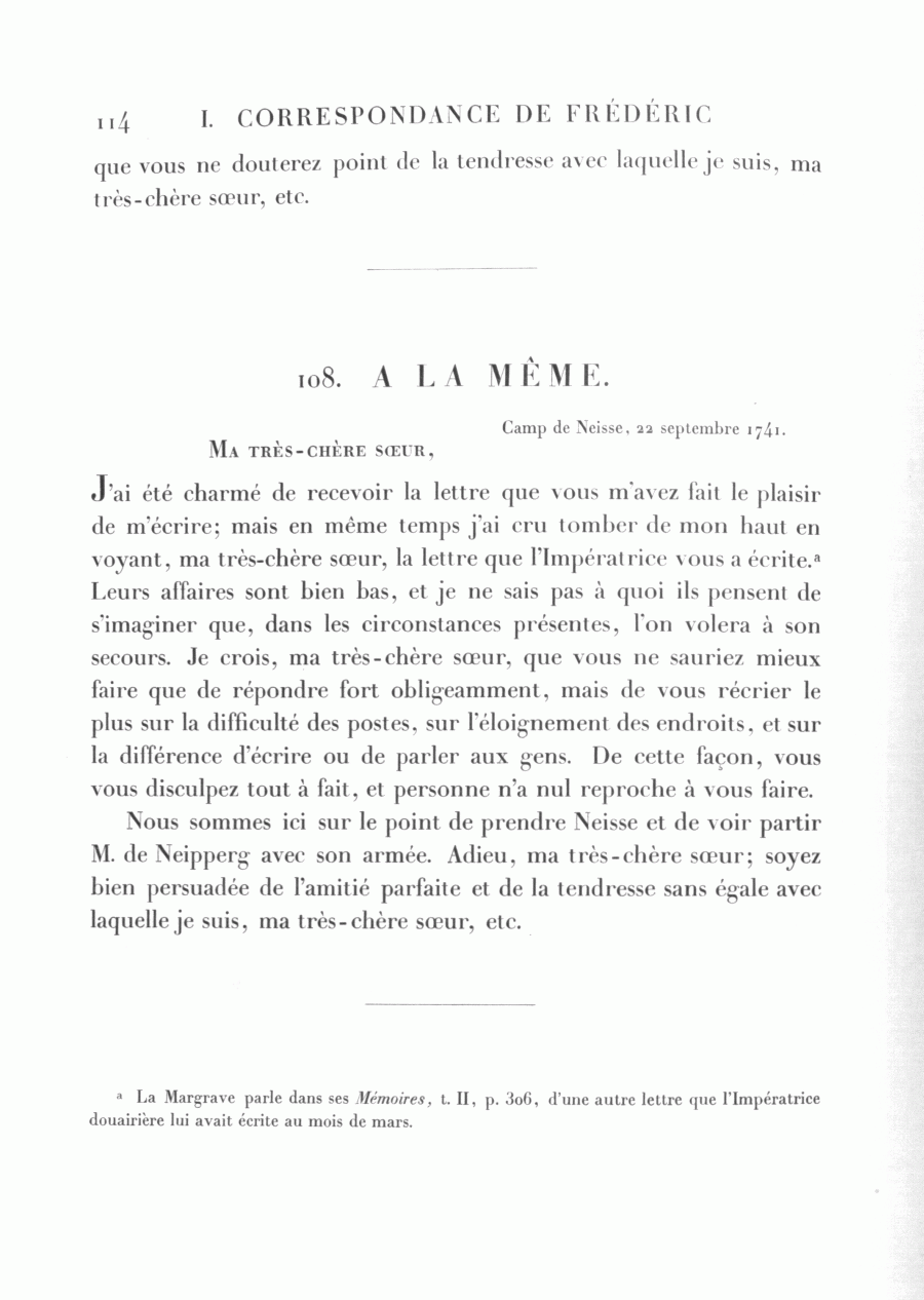 J'ai été charmé de recevoir la lettre que vous m'avez fait le plaisir de m'écrire; mais en même temps j'ai cru tomber de mon haut en voyant, ma très-chère sœur, la lettre que l'Impératrice vous a écrite.a Leurs affaires sont bien bas, et je ne sais pas à quoi ils pensent de s'imaginer que, dans les circonstances présentes, l'on volera à son secours. Je crois, ma très-chère sœur, que vous ne sauriez mieux faire que de répondre fort obligeamment, mais de vous récrier le plus sur la difficulté des postes, sur l'éloignement des endroits, et sur la différence d'écrire ou de parler aux gens. De cette façon, vous vous disculpez tout à fait, et personne n'a nul reproche à vous faire. Nous sommes ici sur le point de prendre Neisse et de voir partir M. de Neipperg avec son armée. Adieu, ma très-chère sœur; soyez bien persuadée de l'amitié parfaite et de la tendresse sans égale avec laquelle je suis, ma très-chère sœur, etc.