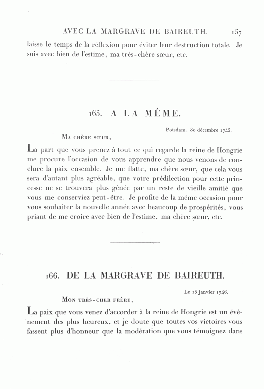 <157> laisse le temps de la réflexion pour éviter leur destruction totale. Je suis avec bien de l'estime, ma très-chère sœur, etc.