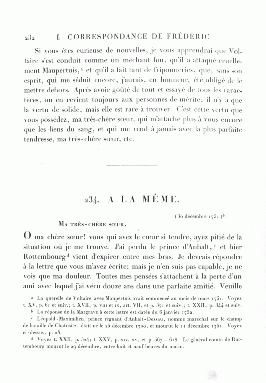 <232>Si vous êtes curieuse de nouvelles, je vous apprendrai que Voltaire s'est conduit comme un méchant fou, qu'il a attaqué cruellement Maupertuis,a et qu'il a fait tant de friponneries, que, sans son esprit, qui me séduit encore, j'aurais, en honneur, été obligé de le mettre dehors. Après avoir goûté de tout et essayé de tous les caractères, on en revient toujours aux personnes de mérite; il n'y a que la vertu de solide, mais elle est rare à trouver. C'est cette vertu que vous possédez, ma très-chère sœur, qui m'attache plus à vous encore que les liens du sang, et qui me rend à jamais avec la plus parfaite tendresse, ma très-chère sœur, etc.