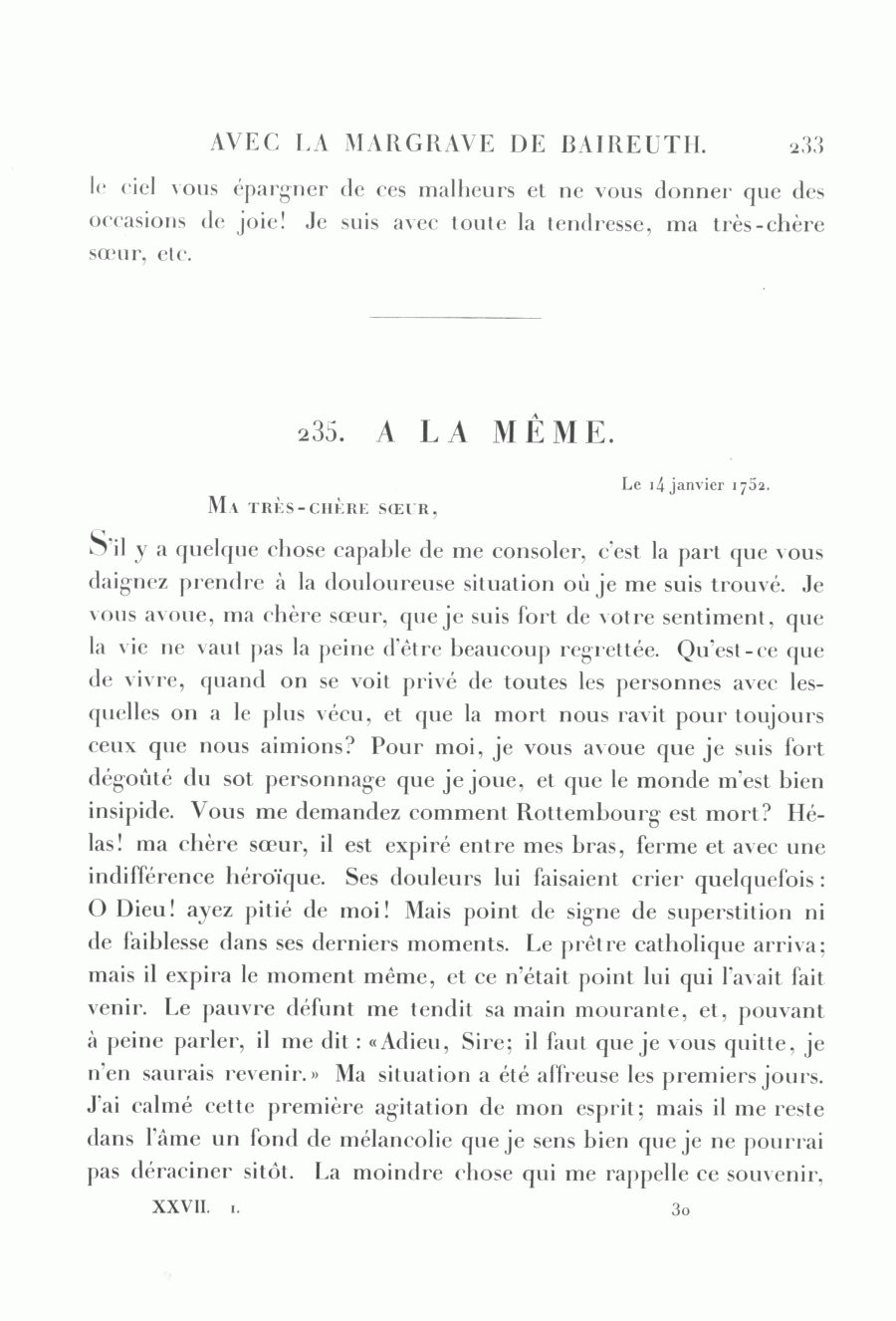 S'il y a quelque chose capable de me consoler, c'est la part que vous daignez prendre à la douloureuse situation où je me suis trouvé. Je vous avoue, ma chère sœur, que je suis fort de votre sentiment, que la vie ne vaut pas la peine d'être beaucoup regrettée. Qu'est-ce que de vivre, quand on se voit privé de toutes les personnes avec lesquelles on a le plus vécu, et que la mort nous ravit pour toujours ceux que nous aimions? Pour moi, je vous avoue que je suis fort dégoûté du sot personnage que je joue, et que le monde m'est bien insipide. Vous me demandez comment Rottembourg est mort? Hélas! ma chère sœur, il est expiré entre mes bras, ferme et avec une indifférence héroïque. Ses douleurs lui faisaient crier quelquefois : O Dieu! ayez pitié de moi! Mais point de signe de superstition ni de faiblesse dans ses derniers moments. Le prêtre catholique arriva; mais il expira le moment même, et ce n'était point lui qui l'avait fait venir. Le pauvre défunt me tendit sa main mourante, et, pouvant à peine parler, il me dit : « Adieu, Sire; il faut que je vous quitte, je n'en saurais revenir. » Ma situation a été affreuse les premiers jours. J'ai calmé cette première agitation de mon esprit; mais il me reste dans l'âme un fond de mélancolie que je sens bien que je ne pourrai pas déraciner sitôt. La moindre chose qui me rappelle ce souvenir,