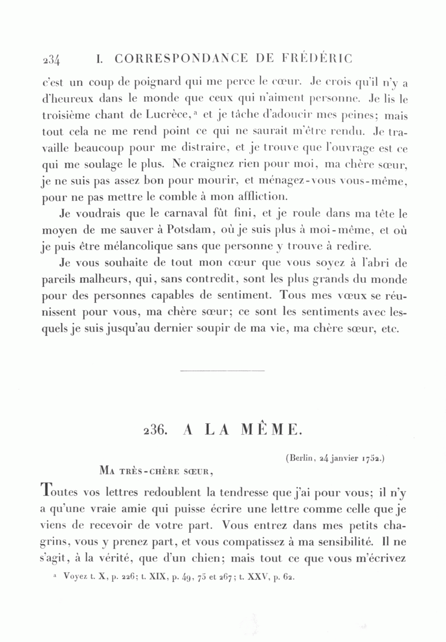 <234> c'est un coup de poignard qui me perce le cœur. Je crois qu'il n'y a d'heureux dans le monde que ceux qui n'aiment personne. Je lis le troisième chant de Lucrèce,a et je tâche d'adoucir mes peines; mais tout cela ne me rend point ce qui ne saurait m'être rendu. Je travaille beaucoup pour me distraire, et je trouve que l'ouvrage est ce qui me soulage le plus. Ne craignez rien pour moi, ma chère sœur, je ne suis pas assez bon pour mourir, et ménagez-vous vous-même, pour ne pas mettre le comble à mon affliction.