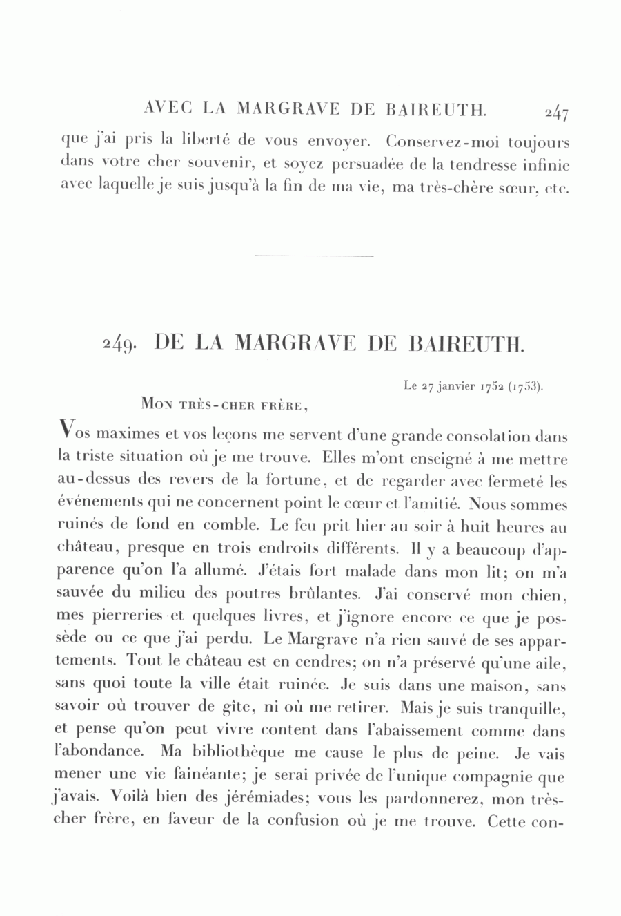 Vos maximes et vos leçons me servent d'une grande consolation dans la triste situation où je me trouve. Elles m'ont enseigné à me mettre au-dessus des revers de la fortune, et de regarder avec fermeté les événements qui ne concernent point le cœur et l'amitié. Nous sommes ruinés de fond en comble. Le feu prit hier au soir à huit heures au château, presque en trois endroits différents. Il y a beaucoup d'apparence qu'on l'a allumé. J'étais fort malade dans mon lit; on m'a sauvée du milieu des poutres brûlantes. J'ai conservé mon chien, mes pierreries et quelques livres, et j'ignore encore ce que je possède ou ce que j'ai perdu. Le Margrave n'a rien sauvé de ses appartements. Tout le château est en cendres; on n'a préservé qu'une aile, sans quoi toute la ville était ruinée. Je suis dans une maison, sans savoir où trouver de gîte, ni où me retirer. Mais je suis tranquille, et pense qu'on peut vivre content dans l'abaissement comme dans l'abondance. Ma bibliothèque me cause le plus de peine. Je vais mener une vie fainéante; je serai privée de l'unique compagnie que j'avais. Voilà bien des jérémiades; vous les pardonnerez, mon très-cher frère, en faveur de la confusion où je me trouve. Cette con-