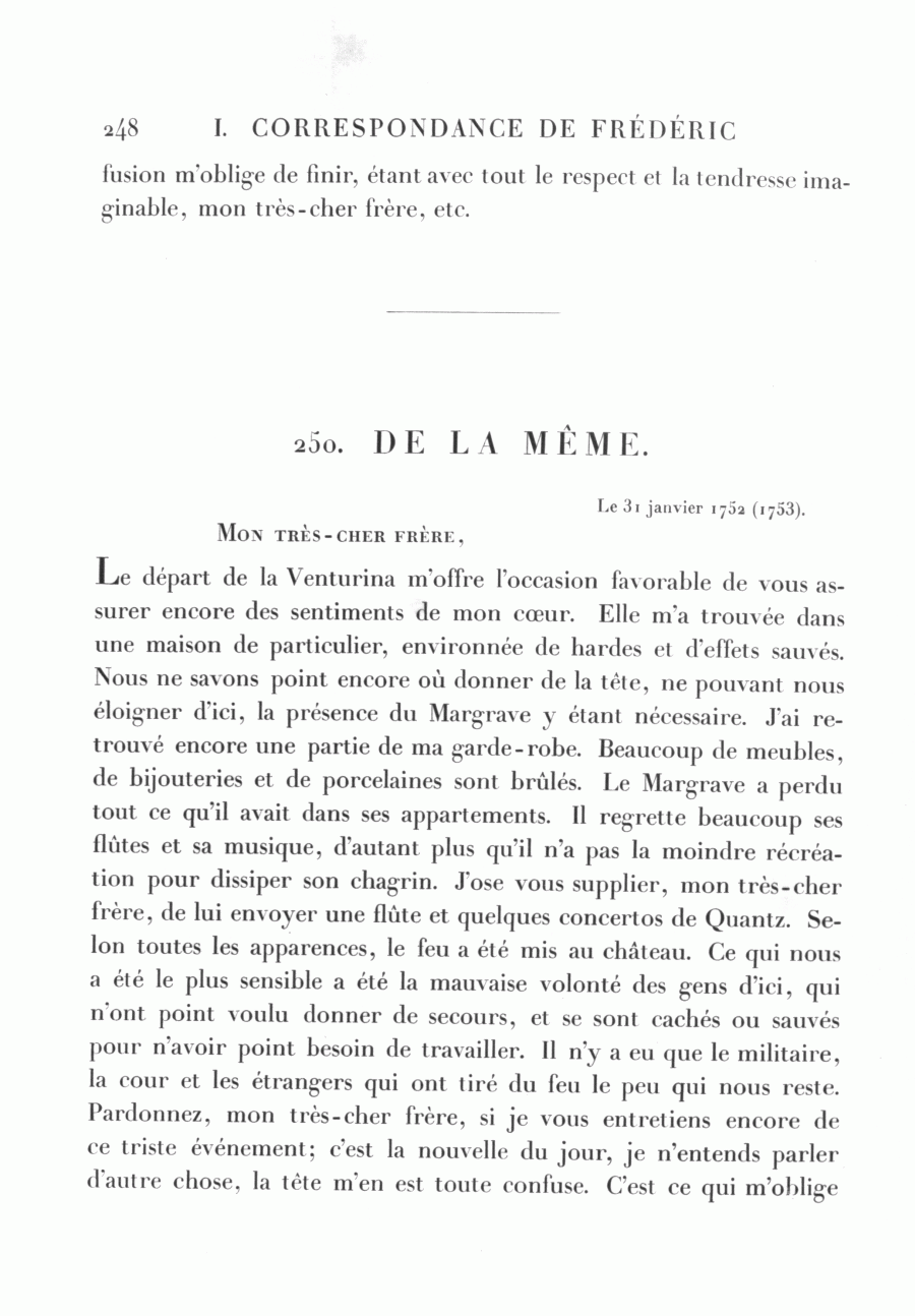 Le départ de la Venturina m'offre l'occasion favorable de vous assurer encore des sentiments de mon cœur. Elle m'a trouvée dans une maison de particulier, environnée de hardes et d'effets sauvés. Nous ne savons point encore où donner de la tête, ne pouvant nous éloigner d'ici, la présence du Margrave y étant nécessaire. J'ai retrouvé encore une partie de ma garde-robe. Beaucoup de meubles, de bijouteries et de porcelaines sont brûlés. Le Margrave a perdu tout ce qu'il avait dans ses appartements. Il regrette beaucoup ses flûtes et sa musique, d'autant plus qu'il n'a pas la moindre récréation pour dissiper son chagrin. J'ose vous supplier, mon très-cher frère, de lui envoyer une flûte et quelques concertos de Quantz. Selon toutes les apparences, le feu a été mis au château. Ce qui nous a été le plus sensible a été la mauvaise volonté des gens d'ici, qui n'ont point voulu donner de secours, et se sont cachés ou sauvés pour n'avoir point besoin de travailler. Il n'y a eu que le militaire, la cour et les étrangers qui ont tiré du feu le peu qui nous reste. Pardonnez, mon très-cher frère, si je vous entretiens encore de ce triste événement; c'est la nouvelle du jour, je n'entends parler d'autre chose, la tête m'en est toute confuse. C'est ce qui m'oblige