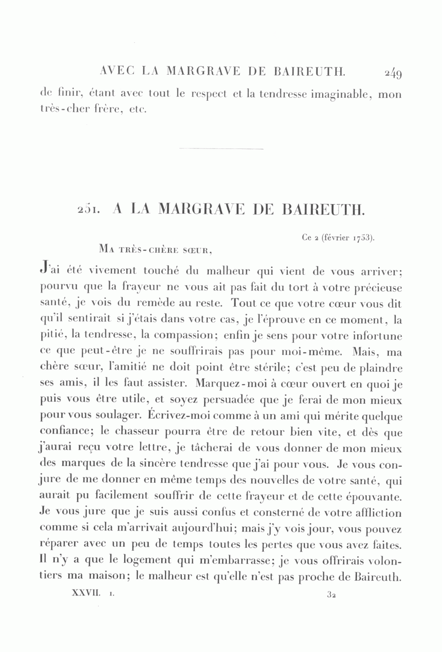 J'ai été vivement touché du malheur qui vient de vous arriver; pourvu que la frayeur ne vous ait pas fait du tort à votre précieuse santé, je vois du remède au reste. Tout ce que votre cœur vous dit qu'il sentirait si j'étais dans votre cas, je l'éprouve en ce moment, la pitié, la tendresse, la compassion; enfin je sens pour votre infortune ce que peut-être je ne souffrirais pas pour moi-même. Mais, ma chère sœur, l'amitié ne doit point être stérile; c'est peu de plaindre ses amis, il les faut assister. Marquez-moi à cœur ouvert en quoi je puis vous être utile, et soyez persuadée que je ferai de mon mieux pour vous soulager. Écrivez-moi comme à un ami qui mérite quelque confiance; le chasseur pourra être de retour bien vite, et dès que j'aurai reçu votre lettre, je tâcherai de vous donner de mon mieux des marques de la sincère tendresse que j'ai pour vous. Je vous conjure de me donner en même temps des nouvelles de votre santé, qui aurait pu facilement souffrir de cette frayeur et de cette épouvante. Je vous jure que je suis aussi confus et consterné de votre affliction comme si cela m arrivait aujourd'hui; mais j'y vois jour, vous pouvez réparer avec un peu de temps toutes les pertes que vous avez faites. Il n'y a que le logement qui m'embarrasse; je vous offrirais volontiers ma maison; le malheur est qu'elle n'est pas proche de Baireuth.
