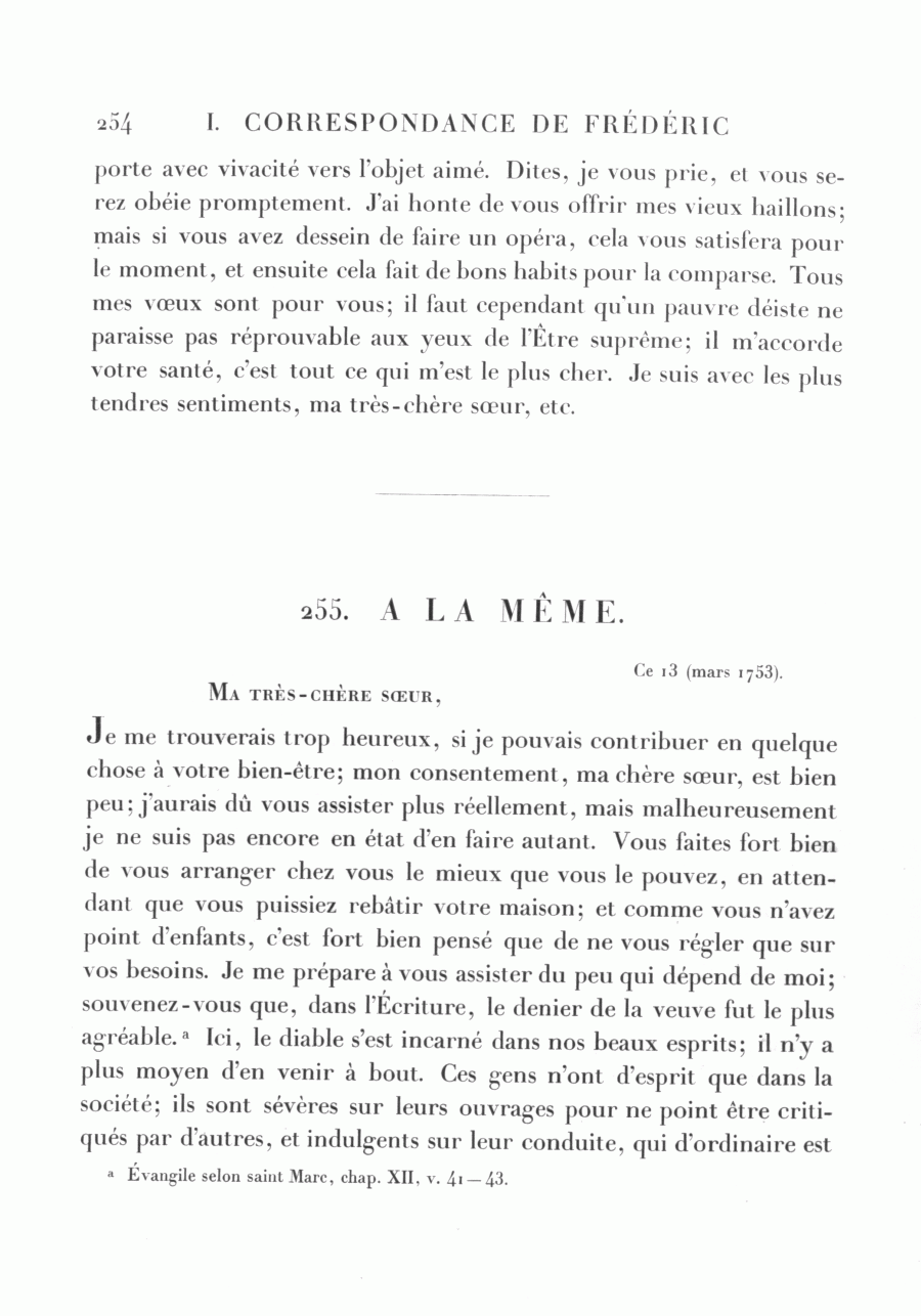 <254> porte avec vivacité vers l'objet aimé. Dites, je vous prie, et vous serez obéie promptement. J'ai honte de vous offrir mes vieux haillons; mais si vous avez dessein de faire un opéra, cela vous satisfera pour le moment, et ensuite cela fait de bons habits pour la comparse. Tous mes vœux sont pour vous; il faut cependant qu'un pauvre déiste ne paraisse pas réprouvable aux yeux de l'Être suprême; il m'accorde votre santé, c'est tout ce qui m'est le plus cher. Je suis avec les plus tendres sentiments, ma très-chère sœur, etc.
