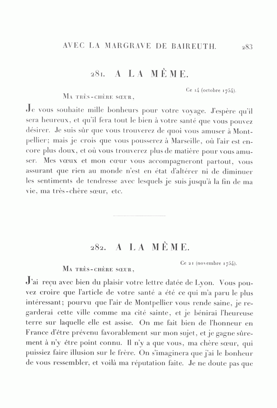 J'ai reçu avec bien du plaisir votre lettre datée de Lyon. Vous pouvez croire que l'article de votre santé a été ce qui m'a paru le plus intéressant; pourvu que l'air de Montpellier vous rende saine, je regarderai cette ville comme ma cité sainte, et je bénirai l'heureuse terre sur laquelle elle est assise. On me fait bien de l'honneur en France d'être prévenu favorablement sur mon sujet, et je gagne sûrement à n'y être point connu. Il n'y a que vous, ma chère sœur, qui puissiez faire illusion sur le frère. On s'imaginera que j'ai le bonheur de vous ressembler, et voilà ma réputation faite. Je ne doute pas que