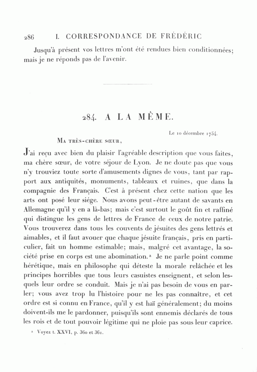 J'ai reçu avec bien du plaisir l'agréable description que vous faites, ma chère sœur, de votre séjour de Lyon. Je ne doute pas que vous n'y trouviez toute sorte d'amusements dignes de vous, tant par rapport aux antiquités, monuments, tableaux et ruines, que dans la compagnie des Français. C'est à présent chez cette nation que les arts ont posé leur siége. Nous avons peut-être autant de savants en Allemagne qu'il y en a là-bas; mais c'est surtout le goût fin et raffiné qui distingue les gens de lettres de France de ceux de notre patrie. Vous trouverez dans tous les couvents de jésuites des gens lettrés et aimables, et il faut avouer que chaque jésuite français, pris en particulier, fait un homme estimable; mais, malgré cet avantage, la société prise en corps est une abomination.a Je ne parle point comme hérétique, mais en philosophe qui déteste la morale relâchée et les principes horribles que tous leurs casuistes enseignent, et selon lesquels leur ordre se conduit. Mais je n'ai pas besoin de vous en parler; vous avez trop lu l'histoire pour ne les pas connaître, et cet ordre est si connu en France, qu'il y est haï généralement; du moins doivent-ils me le pardonner, puisqu'ils sont ennemis déclarés de tous les rois et de tout pouvoir légitime qui ne ploie pas sous leur caprice.