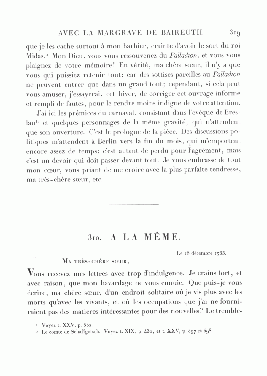 <319> que je les cache surtout à mon barbier, crainte d'avoir le sort du roi Midas.a Mon Dieu, vous vous ressouvenez du Palladion, et vous vous plaignez de votre mémoire! En vérité, ma chère sœur, il n'y a que vous qui puissiez retenir tout; car des sottises pareilles au Palladion ne peuvent entrer que dans un grand tout; cependant, si cela peut vous amuser, j'essayerai, cet hiver, de corriger cet ouvrage informe et rempli de fautes, pour le rendre moins indigne de votre attention. J'ai ici les prémices du carnaval, consistant dans l'évêque de Breslaub et quelques personnages de la même gravité, qui n'attendent que son ouverture. C'est le prologue de la pièce. Des discussions politiques m'attendent à Berlin vers la fin du mois, qui m'emportent encore assez de temps; c'est autant de perdu pour l'agrément, mais c'est un devoir qui doit passer devant tout. Je vous embrasse de tout mon cœur, vous priant de me croire avec la plus parfaite tendresse, ma très-chère sœur, etc.