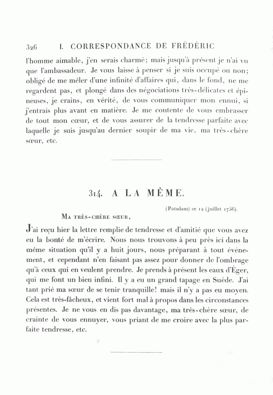 <326> l'homme aimable, j'en serais charmé; mais jusqu'à présent je n'ai vu que l'ambassadeur. Je vous laisse à penser si je suis occupé ou non; obligé de me mêler d'une infinité d'affaires qui, dans le fond, ne me regardent pas, et plongé dans des négociations très-délicates et épineuses, je crains, en vérité, de vous communiquer mon ennui, si j'entrais plus avant en matière. Je me contente de vous embrasser de tout mon cœur, et de vous assurer de la tendresse parfaite avec laquelle je suis jusqu'au dernier soupir de ma vie, ma très-chère sœur, etc.
