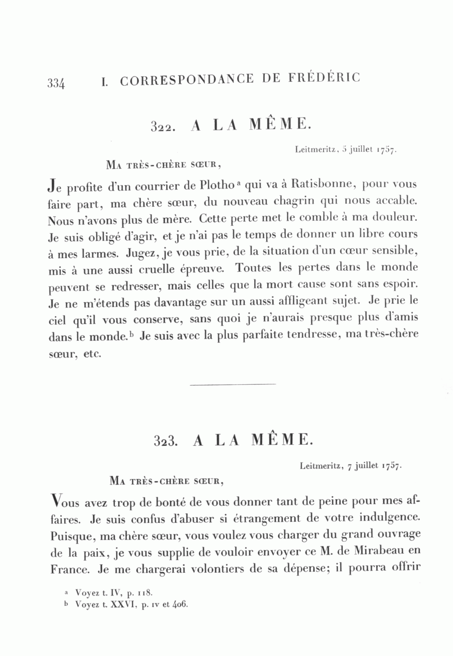 Je profite d'un courrier de Plothoa qui va à Ratisbonne, pour vous faire part, ma chère sœur, du nouveau chagrin qui nous accable. Nous n'avons plus de mère. Cette perte met le comble à ma douleur. Je suis obligé d'agir, et je n'ai pas le temps de donner un libre cours à mes larmes. Jugez, je vous prie, de la situation d'un cœur sensible, mis à une aussi cruelle épreuve. Toutes les pertes dans le monde peuvent se redresser, mais celles que la mort cause sont sans espoir. Je ne m'étends pas davantage sur un aussi affligeant sujet. Je prie le ciel qu'il vous conserve, sans quoi je n'aurais presque plus d'amis dans le monde.b Je suis avec la plus parfaite tendresse, ma très-chère sœur, etc.
