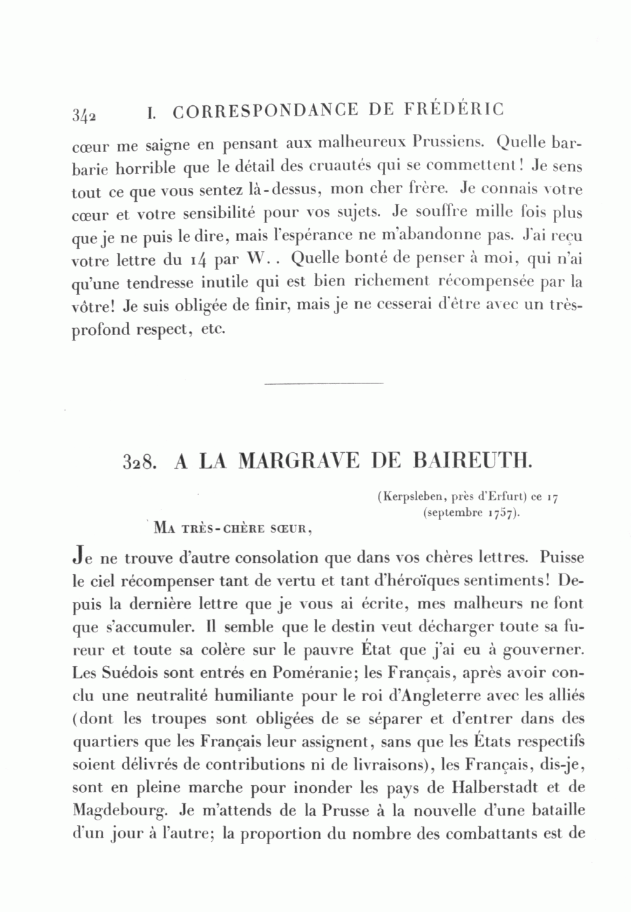 <342> cœur me saigne en pensant aux malheureux Prussiens. Quelle barbarie horrible que le détail des cruautés qui se commettent! Je sens tout ce que vous sentez là-dessus, mon cher frère. Je connais votre cœur et votre sensibilité pour vos sujets. Je souffre mille fois plus que je ne puis le dire, mais l'espérance ne m'abandonne pas. J'ai reçu votre lettre du 14 par W.. Quelle bonté de penser à moi, qui n'ai qu'une tendresse inutile qui est bien richement récompensée par la vôtre! Je suis obligée de finir, mais je ne cesserai d'être avec un très-profond respect, etc.