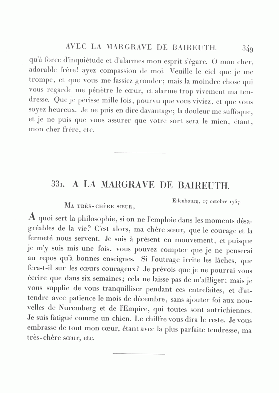 <349> qu'à force d'inquiétude et d'alarmes mon esprit s'égare. O mon cher, adorable frère! ayez compassion de moi. Veuille le ciel que je me trompe, et que vous me fassiez gronder; mais la moindre chose qui vous regarde me pénètre le cœur, et alarme trop vivement ma tendresse. Que je périsse mille fois, pourvu que vous viviez, et que vous soyez heureux. Je ne puis en dire davantage; la douleur me suffoque, et je ne puis que vous assurer que votre sort sera le mien, étant, mon cher frère, etc.
