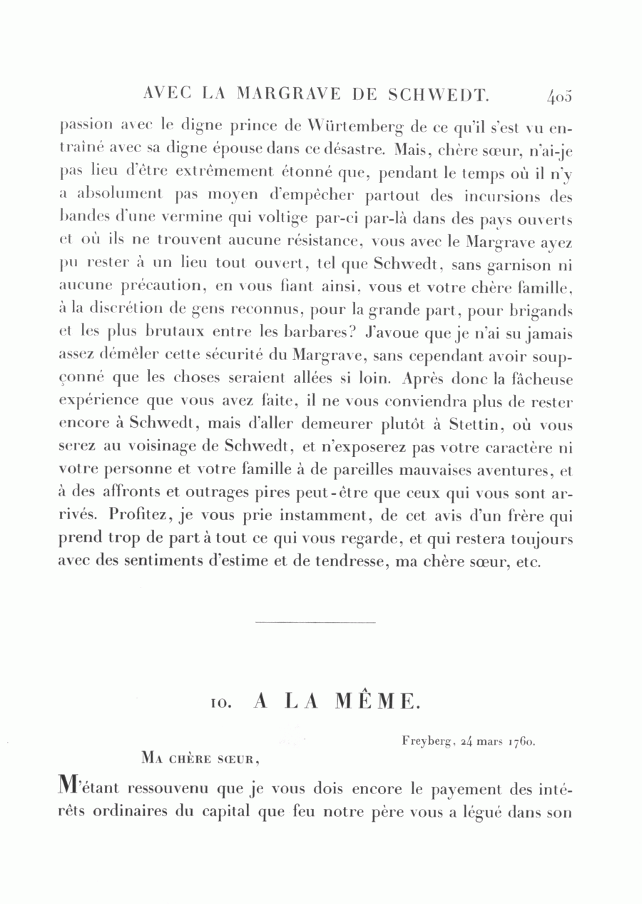 <405>passion avec le digne prince de Würtemberg de ce qu'il s'est vu entraîné avec sa digne épouse dans ce désastre. Mais, chère sœur, n'ai-je pas lieu d'être extrêmement étonné que, pendant le temps où il n'y a absolument pas moyen d'empêcher partout des incursions des bandes d'une vermine qui voltige par-ci par-là dans des pays ouverts et où ils ne trouvent aucune résistance, vous avec le Margrave ayez pu rester à un lieu tout ouvert, tel que Schwedt, sans garnison ni aucune précaution, en vous fiant ainsi, vous et votre chère famille, à la discrétion de gens reconnus, pour la grande part, pour brigands et les plus brutaux entre les barbares? J'avoue que je n'ai su jamais assez démêler cette sécurité du Margrave, sans cependant avoir soupçonné que les choses seraient allées si loin. Après donc la fâcheuse expérience que vous avez faite, il ne vous conviendra plus de rester encore à Schwedt, mais d'aller demeurer plutôt à Stettin, où vous serez au voisinage de Schwedt, et n'exposerez pas votre caractère ni votre personne et votre famille à de pareilles mauvaises aventures, et à des affronts et outrages pires peut-être que ceux qui vous sont arrivés. Profitez, je vous prie instamment, de cet avis d'un frère qui prend trop de part à tout ce qui vous regarde, et qui restera toujours avec des sentiments d'estime et de tendresse, ma chère sœur, etc.