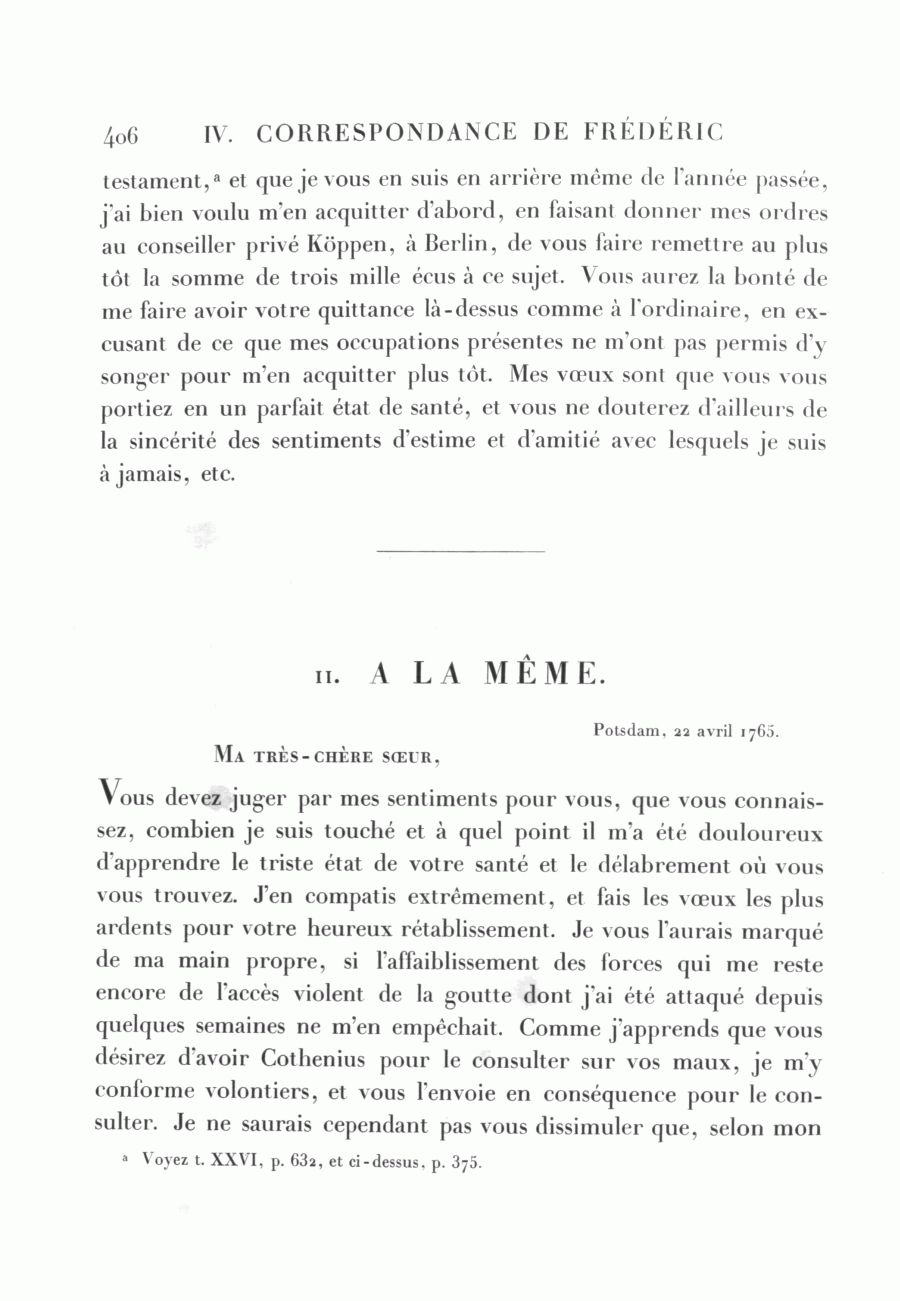 <406> testament,a et que je vous en suis en arrière même de l'année passée, j'ai bien voulu m'en acquitter d'abord, en faisant donner mes ordres au conseiller privé Koppen, à Berlin, de vous faire remettre au plus tôt la somme de trois mille écus à ce sujet. Vous aurez la bonté de me faire avoir votre quittance là-dessus comme à l'ordinaire, en excusant de ce que mes occupations présentes ne m'ont pas permis d'y songer pour m'en acquitter plus tôt. Mes vœux sont que vous vous portiez en un parfait état de santé, et vous ne douterez d'ailleurs de la sincérité des sentiments d'estime et d'amitié avec lesquels je suis à jamais, etc.