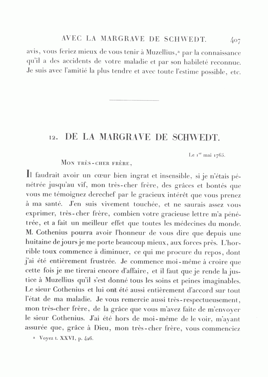 Il faudrait avoir un cœur bien ingrat et insensible, si je n'étais pénétrée jusqu'au vif, mon très-cher frère, des grâces et bontés que vous me témoignez derechef par le gracieux intérêt que vous prenez à ma santé. J'en suis vivement touchée, et ne saurais assez vous exprimer, très-cher frère, combien votre gracieuse lettre m'a pénétrée, et a fait un meilleur effet que toutes les médecines du monde. M. Cothenius pourra avoir l'honneur de vous dire que depuis une huitaine de jours je me porte beaucoup mieux, aux forces près. L'horrible toux commence à diminuer, ce qui me procure du repos, dont j'ai été entièrement frustrée. Je commence moi-même à croire que cette fois je me tirerai encore d'affaire, et il faut que je rende la justice à Muzellius qu'il s'est donné tous les soins et peines imaginables. Le sieur Cothenius et lui ont été aussi entièrement d'accord sur tout l'état de ma maladie. Je vous remercie aussi très-respectueusement, mon très-cher frère, de la grâce que vous m'avez faite de m'envoyer le sieur Cothenius. J'ai été hors de moi-même de le voir, m'ayant assurée que, grâce à Dieu, mon très-cher frère, vous commenciez