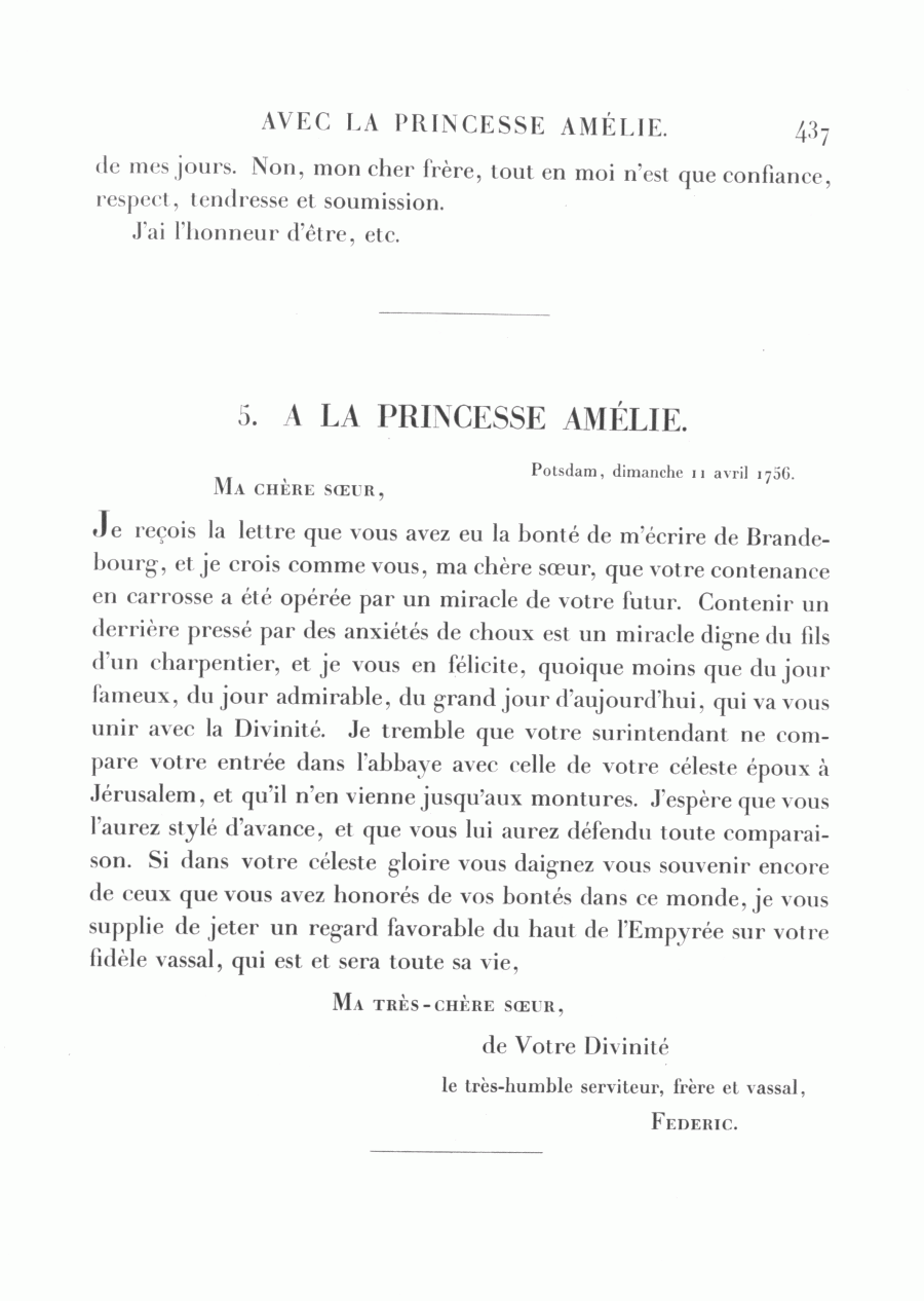 <437> de mes jours. Non, mon cher frère, tout en moi n'est que confiance, respect, tendresse et soumission. J'ai l'honneur d'être, etc.