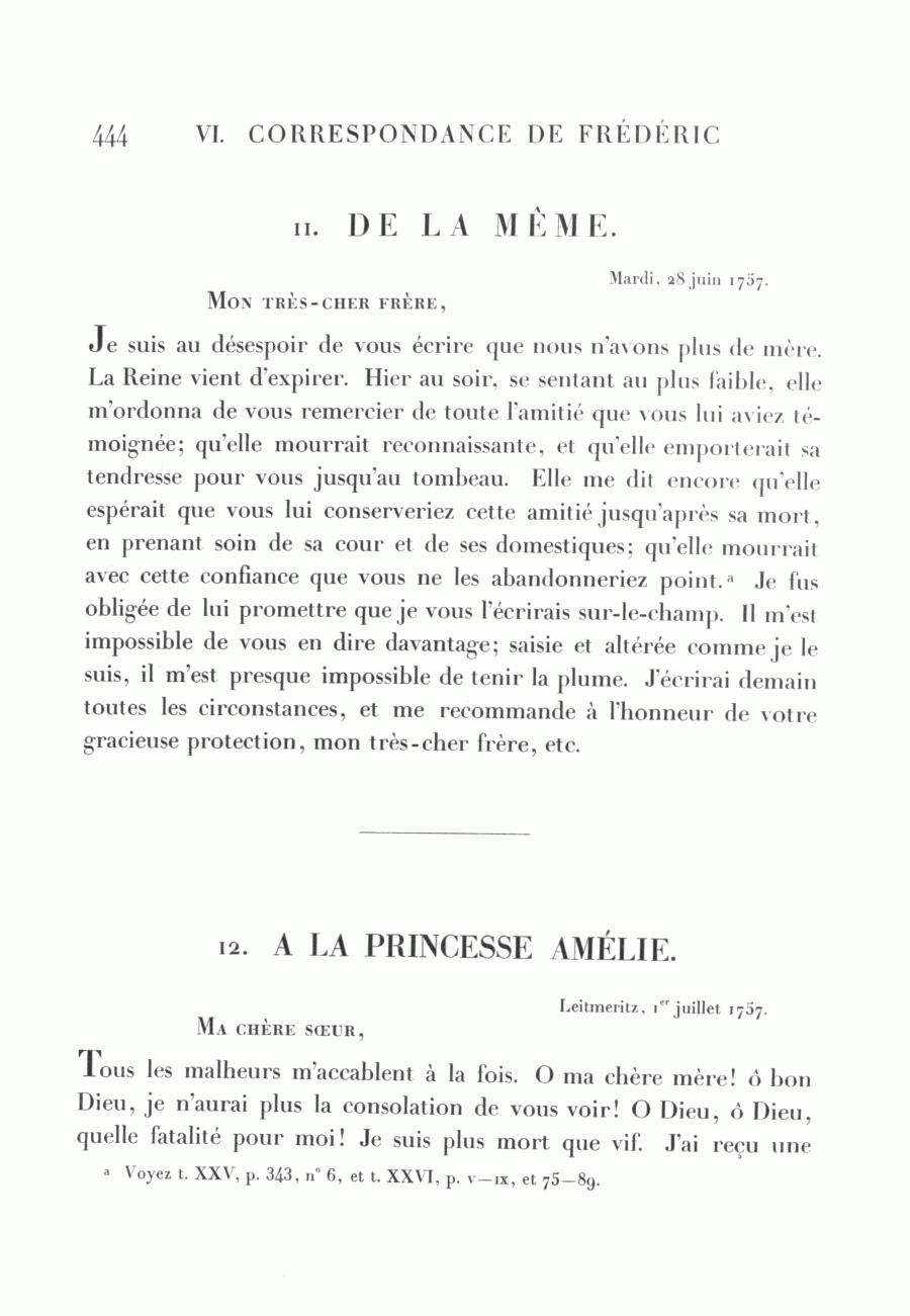 Je suis au désespoir de vous écrire que nous n'avons plus de mère. La Reine vient d'expirer. Hier au soir, se sentant au plus faible, elle m'ordonna de vous remercier de toute l'amitié que vous lui aviez témoignée; qu'elle mourrait reconnaissante, et qu'elle emporterait sa tendresse pour vous jusqu'au tombeau. Elle me dit encore qu'elle espérait que vous lui conserveriez cette amitié jusqu'après sa mort, en prenant soin de sa cour et de ses domestiques; qu'elle mourrait avec cette confiance que vous ne les abandonneriez point.a Je fus obligée de lui promettre que je vous l'écrirais sur-le-champ. Il m'est impossible de vous en dire davantage; saisie et altérée comme je le suis, il m'est presque impossible de tenir la plume. J'écrirai demain toutes les circonstances, et me recommande à l'honneur de votre gracieuse protection, mon très-cher frère, etc.