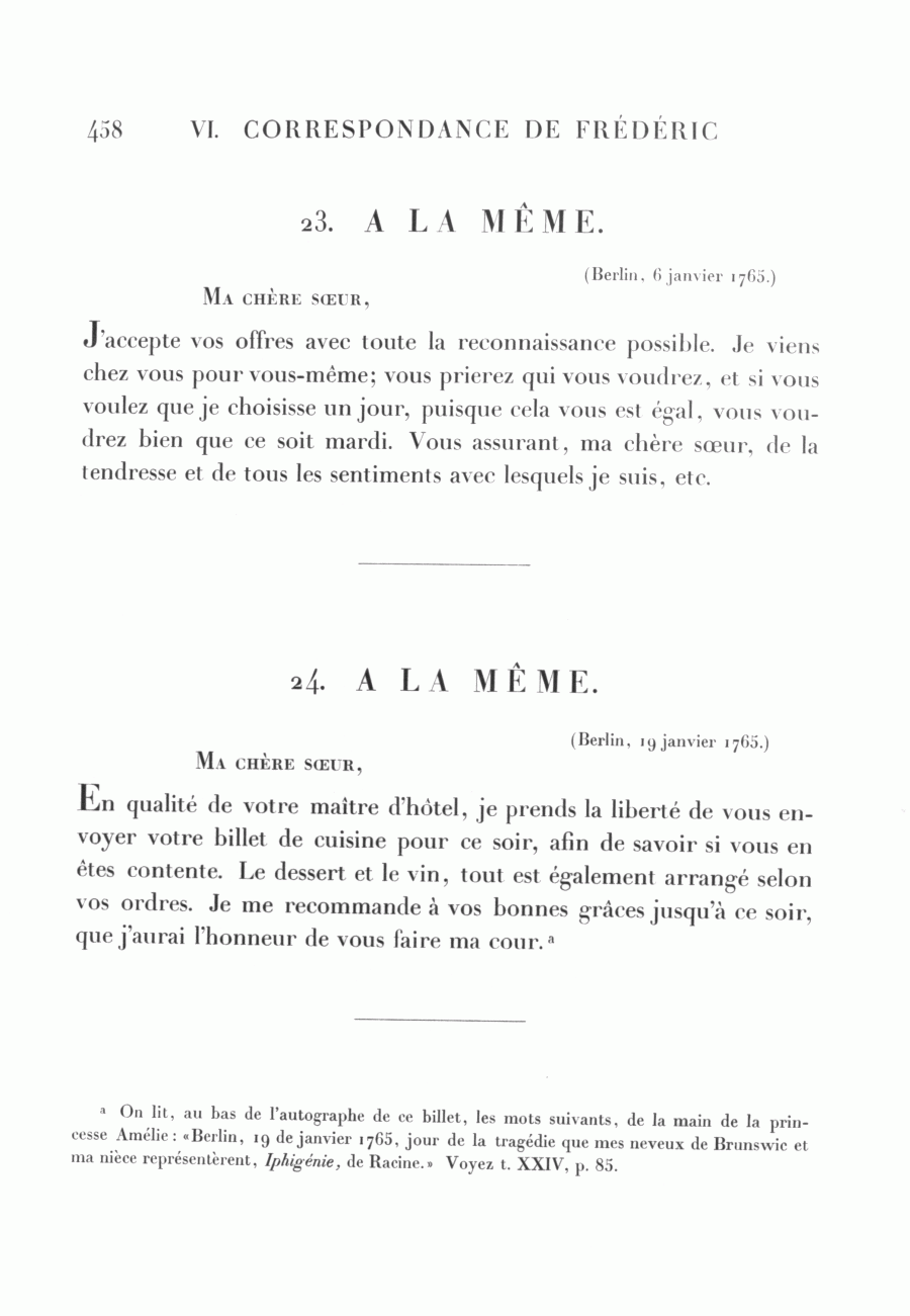 a On lit, au bas de l'autographe de ce billet, les mots suivants, de la main de la princesse Amélie : « Berlin, 19 de janvier 1765, jour de la tragédie que mes neveux de Brunswic et ma nièce représentèrent, Iphigénie, de Racine. » Voyez t. XXIV, p. 85.