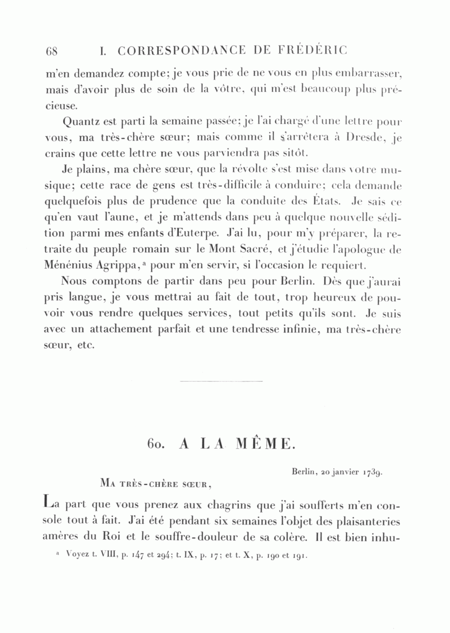 Je plains, ma chère sœur, que la révolte s'est mise dans votre musique; cette race de gens est très-difficile à conduire; cela demande quelquefois plus de prudence que la conduite des États. Je sais ce qu'en vaut l'aune, et je m'attends dans peu à quelque nouvelle sédition parmi mes enfants d'Euterpe. J'ai lu, pour m'y préparer, la retraite du peuple romain sur le Mont Sacré, et j'étudie l'apologue de Ménénius Agrippa,a pour m'en servir, si l'occasion le requiert.