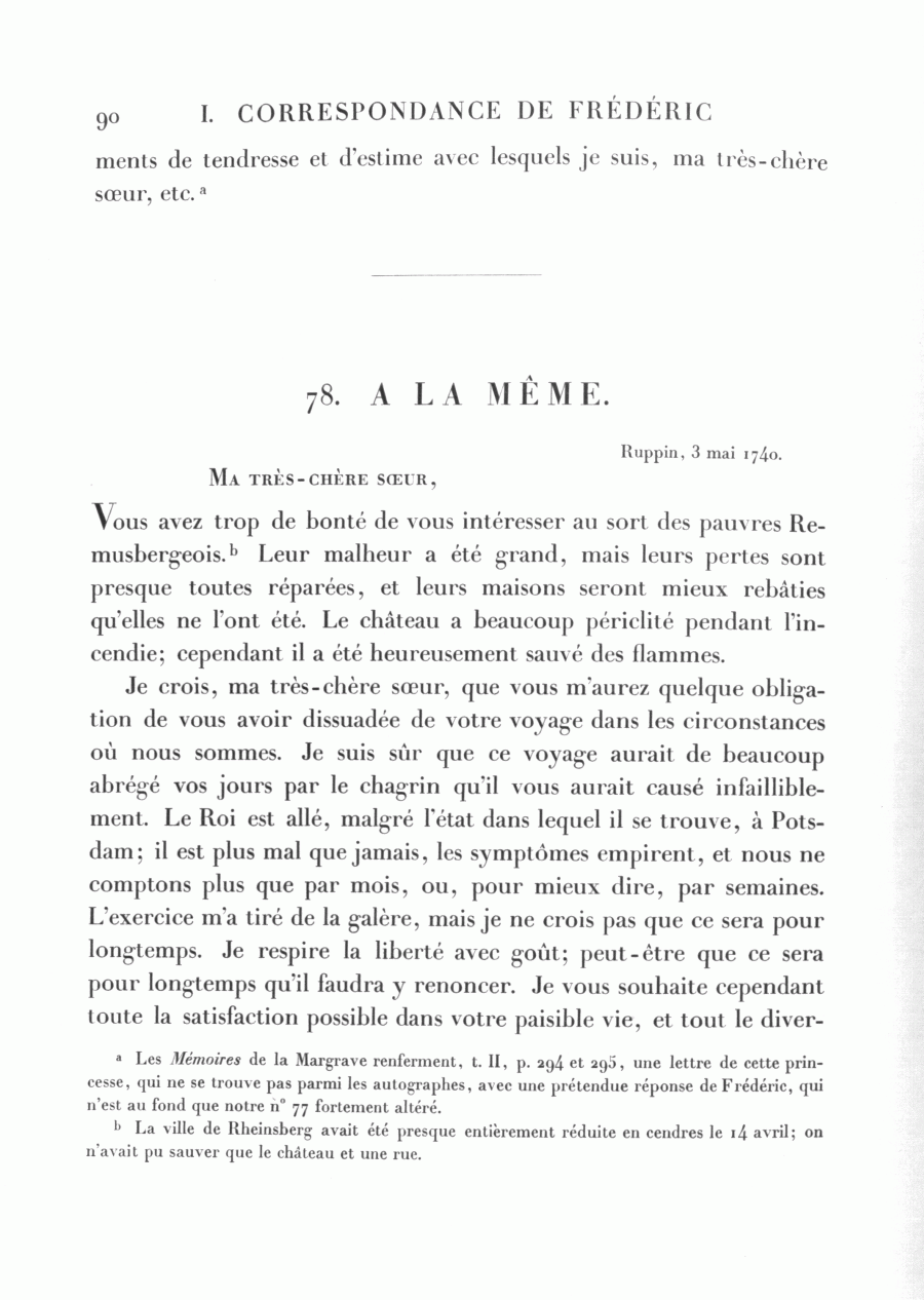 a Les Mémoires de la Margrave renferment, t. II, p. 294 et 295, une lettre de cette princesse, qui ne se trouve pas parmi les autographes, avec une prétendue réponse de Frédéric, qui n'est au fond que notre no 77 fortement altéré.