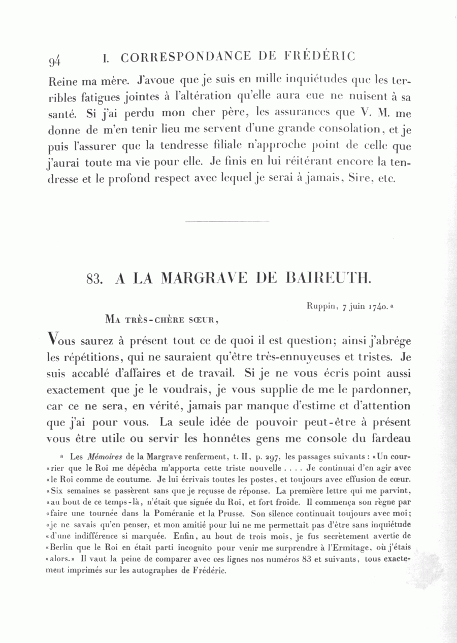 a Les Mémoires de la Margrave renferment, t. II, p. 297, les passages suivants : « Un courrier que le Roi me dépêcha m'apporta cette triste nouvelle .... Je continuai d'en agir avec le Roi comme de coutume. Je lui écrivais toutes les postes, et toujours avec effusion de cœur. Six semaines se passèrent sans que je reçusse de réponse. La première lettre qui me parvint, au bout de ce temps-là, n'était que signée du Roi, et fort froide. Il commença son règne par faire une tournée dans la Poméranie et la Prusse. Son silence continuait toujours avec moi; je ne savais qu'en penser, et mon amitié pour lui ne me permettait pas d'être sans inquiétude d'une indifférence si marquée. Enfin, au bout de trois mois, je fus secrètement avertie de Berlin que le Roi en était parti incognito pour venir me surprendre à l'Ermitage, où j'étais alors. » Il vaut la peine de comparer avec ces lignes nos numéros 83 et suivants, tous exactement imprimés sur les autographes de Frédéric.