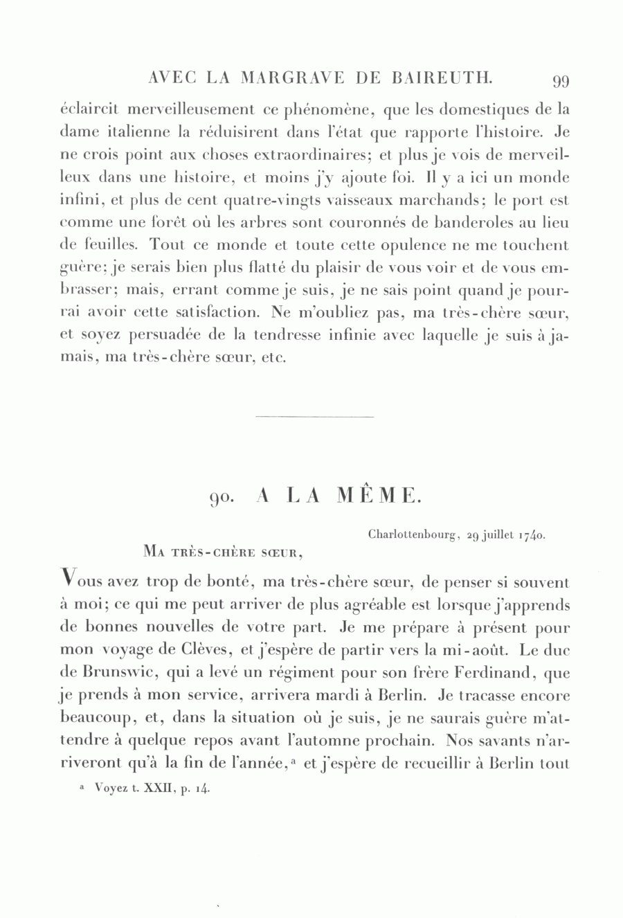 Vous avez trop de bonté, ma très-chère sœur, de penser si souvent à moi; ce qui me peut arriver de plus agréable est lorsque j'apprends de bonnes nouvelles de votre part. Je me prépare à présent pour mon voyage de Clèves, et j'espère de partir vers la mi-août. Le duc de Brunswic, qui a levé un régiment pour son frère Ferdinand, que je prends à mon service, arrivera mardi à Berlin, Je tracasse encore beaucoup, et, dans la situation où je suis, je ne saurais guère m'attendre à quelque repos avant l'automne prochain. Nos savants n'arriveront qu'à la fin de l'année,a et j'espère de recueillir à Berlin tout