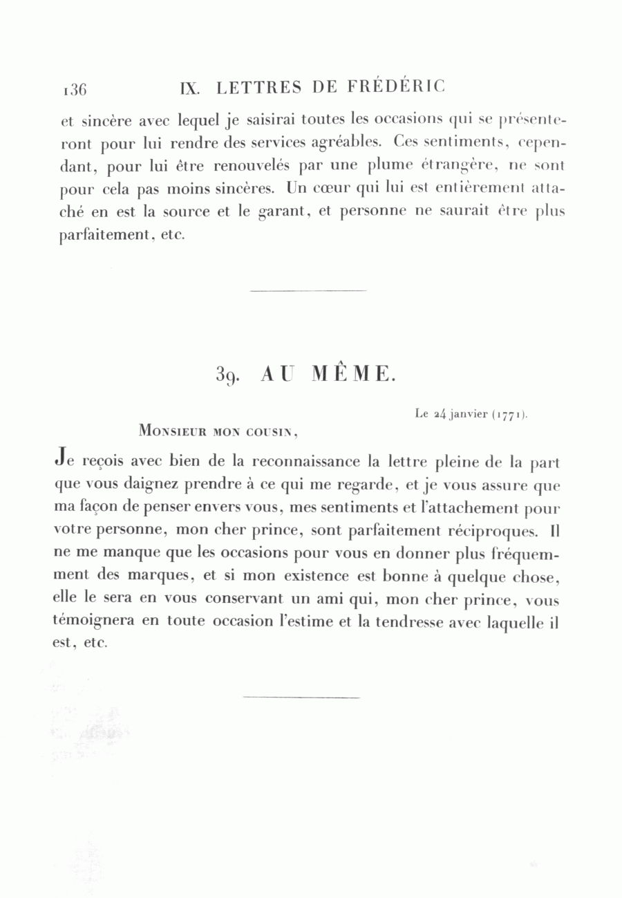 <136> et sincère avec lequel je saisirai toutes les occasions qui se présenteront pour lui rendre des services agréables. Ces sentiments, cependant, pour lui être renouvelés par une plume étrangère, ne sont pour cela pas moins sincères. Un cœur qui lui est entièrement attaché en est la source et le garant, et personne ne saurait être plus parfaitement, etc.
