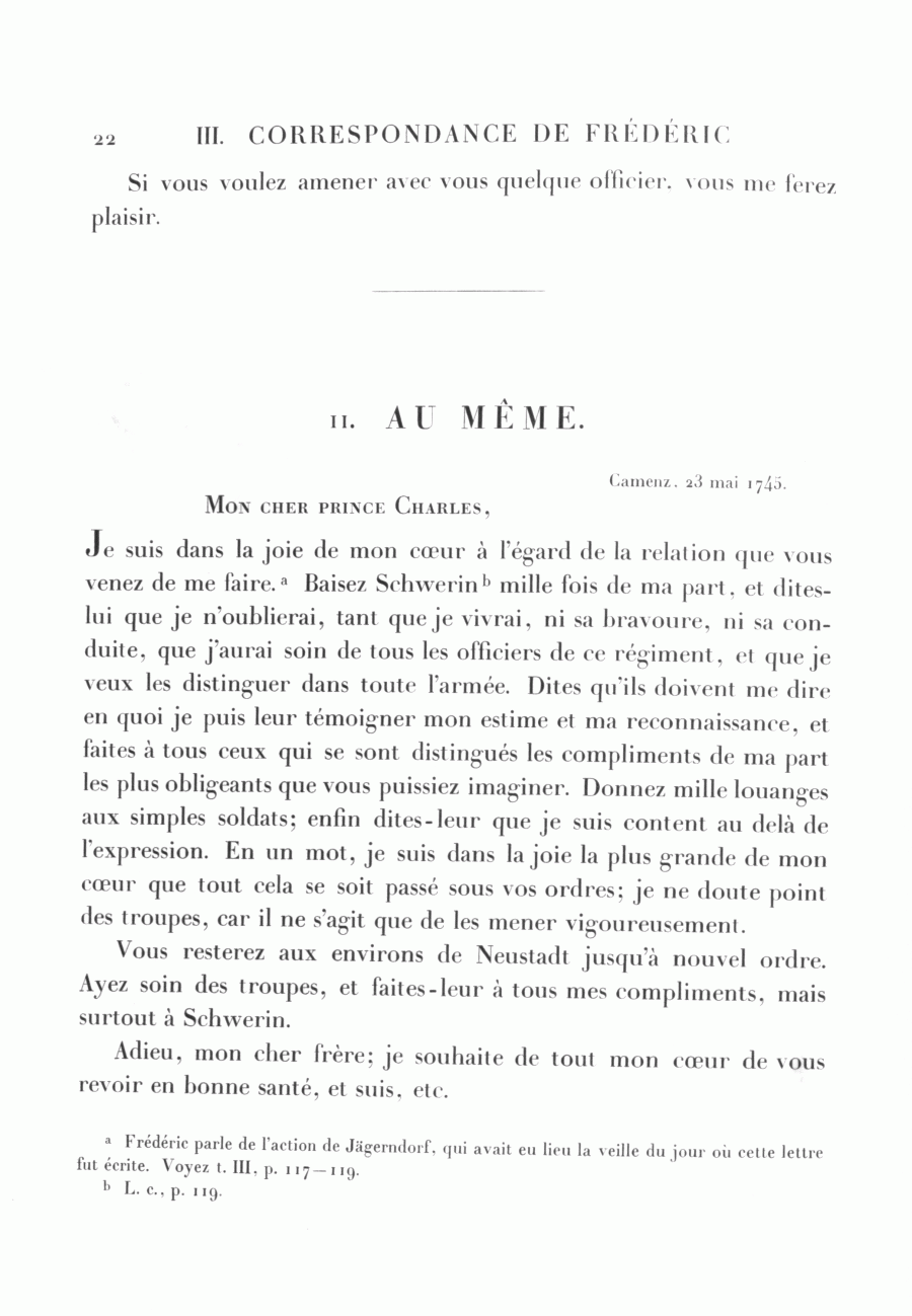 Je suis dans la joie de mon cœur à l'égard de la relation que vous venez de me faire.a Baisez Schwerinb mille fois de ma part, et dites-lui que je n'oublierai, tant que je vivrai, ni sa bravoure, ni sa conduite, que j'aurai soin de tous les officiers de ce régiment, et que je veux les distinguer dans toute l'armée. Dites qu'ils doivent me dire en quoi je puis leur témoigner mon estime et ma reconnaissance, et faites à tous ceux qui se sont distingués les compliments de ma part les plus obligeants que vous puissiez imaginer. Donnez mille louanges aux simples soldats; enfin dites-leur que je suis content au delà de l'expression. En un mot, je suis dans la joie la plus grande de mon cœur que tout cela se soit passé sous vos ordres; je ne doute point des troupes, car il ne s'agit que de les mener vigoureusement.