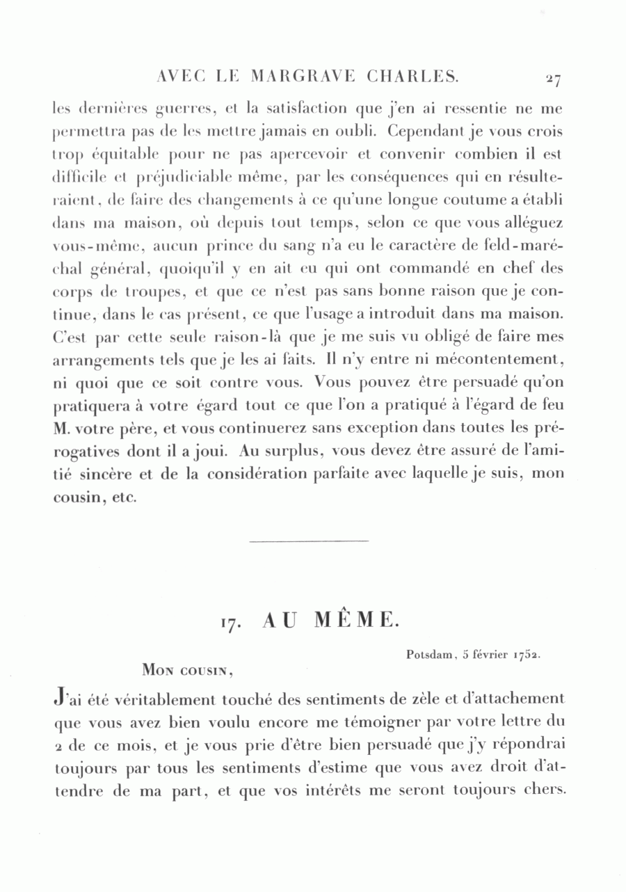<27> les dernières guerres, et la satisfaction que j'en ai ressentie ne me permettra pas de les mettre jamais en oubli. Cependant je vous crois trop équitable pour ne pas apercevoir et convenir combien il est difficile et préjudiciable même, par les conséquences qui en résulteraient, de faire des changements à ce qu'une longue coutume a établi dans ma maison, où depuis tout temps, selon ce que vous alléguez vous-même, aucun prince du sang n'a eu le caractère de feld-maréchal général, quoiqu'il y en ail eu qui ont commandé en chef des corps de troupes, et que ce n'est pas sans bonne raison que je continue, dans le cas présent, ce que l'usage a introduit dans ma maison. C'est par cette seule raison-là que je me suis vu obligé de faire mes arrangements tels que je les ai faits. Il n'y entre ni mécontentement, ni quoi que ce soit contre vous. Vous pouvez être persuadé qu'on pratiquera à votre égard tout ce que l'on a pratiqué à l'égard de feu M. votre père, et vous continuerez sans exception dans toutes les prérogatives dont il a joui. Au surplus, vous devez être assuré de l'amitié sincère et de la considération parfaite avec laquelle je suis, mon cousin, etc.
