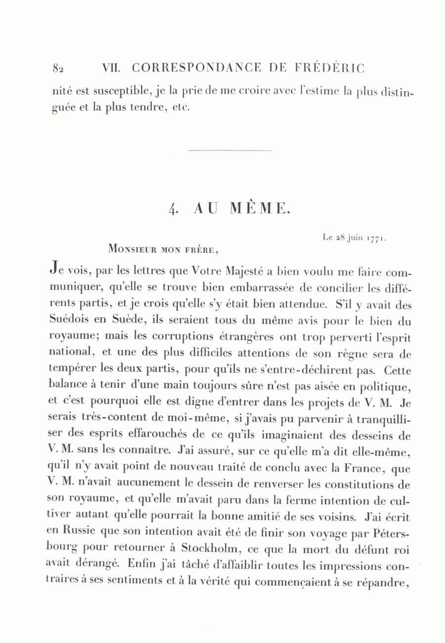 Je vois, par les lettres que Votre Majesté a bien voulu me faire communiquer, qu'elle se trouve bien embarrassée de concilier les différents partis, et je crois qu'elle s'y était bien attendue. S'il y avait des Suédois en Suède, ils seraient tous du même avis pour le bien du royaume; mais les corruptions étrangères ont trop perverti l'esprit national, et une des plus difficiles attentions de son règne sera de tempérer les deux partis, pour qu'ils ne s'entre-déchirent pas. Cette balance à tenir d'une main toujours sûre n'est pas aisée en politique, et c'est pourquoi elle est digne d'entrer dans les projets de V. M. Je serais très-content de moi-même, si j'avais pu parvenir à tranquilliser des esprits effarouchés de ce qu'ils imaginaient des desseins de V. M. sans les connaître. J'ai assuré, sur ce qu'elle m'a dit elle-même, qu'il n'y avait point de nouveau traité de conclu avec la France, que V. M. n'avait aucunement le dessein de renverser les constitutions de son royaume, et qu'elle m'avait paru dans la ferme intention de cultiver autant qu'elle pourrait la bonne amitié de ses voisins. J'ai écrit en Russie que son intention avait été de finir son voyage par Pétersbourg pour retourner à Stockholm, ce que la mort du défunt roi avait dérangé. Enfin j'ai tâché d'affaiblir toutes les impressions contraires à ses sentiments et à la vérité qui commençaient à se répandre,