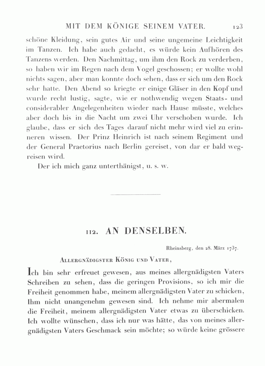 <123> schöne Kleidung, sein gutes Air und seine ungemeine Leichtigkeit im Tanzen. Ich habe auch gedacht, es würde kein Aufhören des Tanzens werden. Den Nachmittag, um ihm den Rock zu verderben, so haben wir im Regen nach dem Vogel geschossen : er wollte wohl nichts sagen, aber man konnte doch sehen, dass er sich um den Rock sehr hatte. Den Abend so kriegte er einige Gläser in den Kopf und wurde recht lustig, sagte, wie er nothwendig wegen Staats- und considerabler Angelegenheiten wieder nach Hause müsste, welches aber doch bis in die Nacht um zwei Uhr verschoben wurde. Ich glaube, dass er sich des Tages darauf nicht mehr wird viel zu erinneren wissen. Der Prinz Heinrich ist nach seinem Regiment und der General Praetorius nach Berlin gereiset, von dar er bald wegreisen wird.
