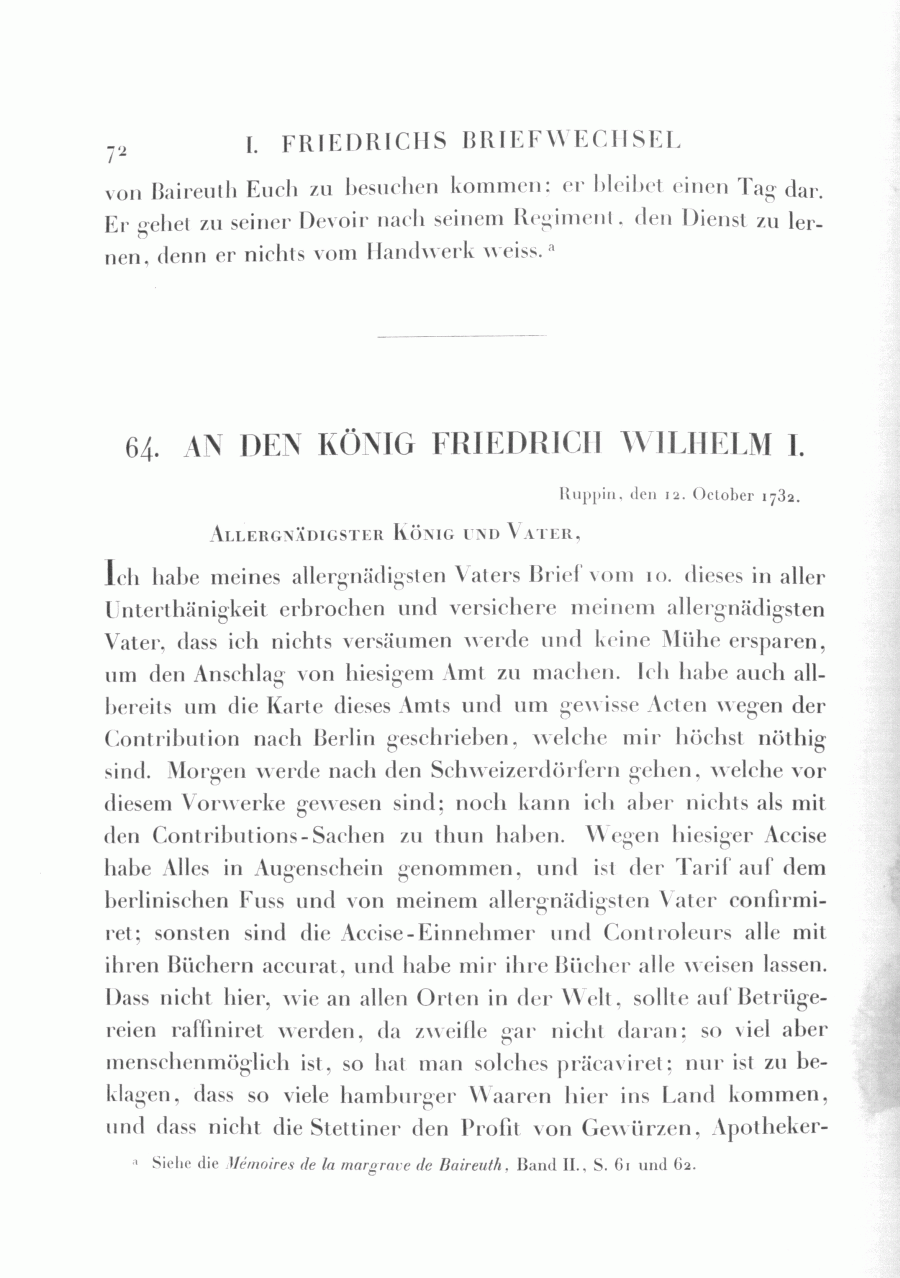 Friedrich an den König Friedrich Wilhelm I., Ruppin, den 12. October 1732Id: d385_ag509-27_3_002064000