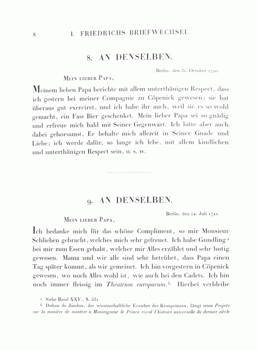 Meinem lieben Papa berichte mit allem unterthänigen Respect, dass ich gestern bei meiner Compagnie zu Cöpenick gewesen; sie hat überaus gut exerciret, und ich habe ihr auch, weil sie es so wohl gemacht, ein Fass Bier geschenket. Mein lieber Papa sei so gnädig und erfreue mich bald mit Seiner Gegenwart. Ich bitte aber auch dabei gehorsamst, Er behalte mich allezeit in Seiner Gnade und Liebe; ich werde dafür, so lange ich lebe, mit allem kindlichen und unterthänigen Respect sein, u. s. w.