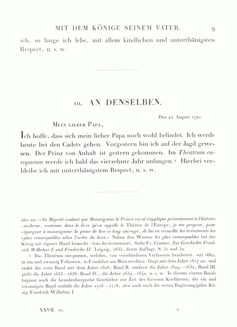 Ich hoffe, dass sich mein lieber Papa noch wohl befindet. Ich werde heute bei den Cadets gehen. Vorgestern bin ich auf der Jagd gewesen. Der Prinz von Anhalt ist gestern gekommen. Im Theatrum europaeum werde ich bald das vierzehnte Jahr anfangen.a Hierbei verbleibe ich mit unterthänigstem Respect, u. s. w.