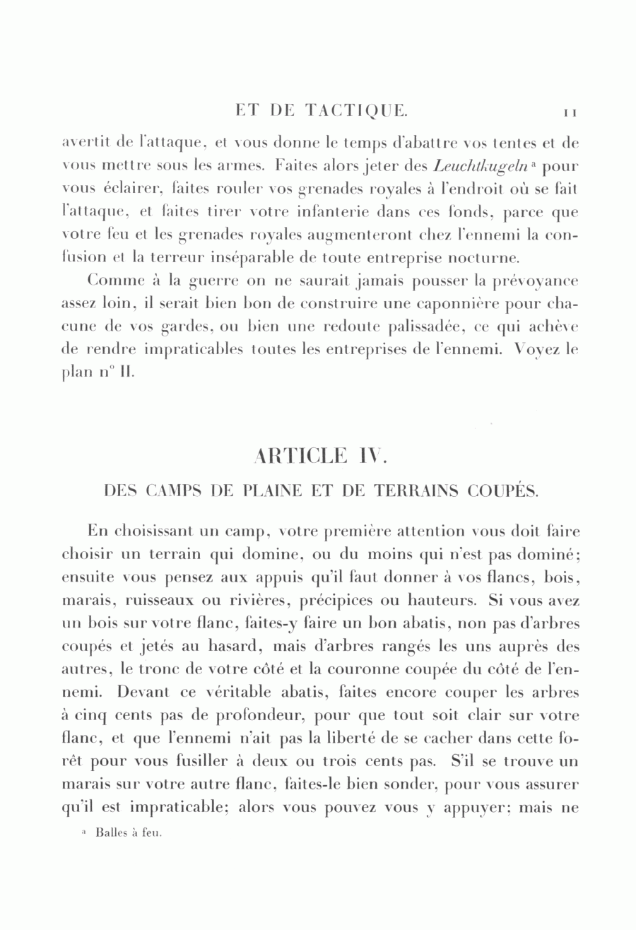 <11> avertit de l'attaque, et vous donne le temps d'abattre vos tentes et de vous mettre sous les armes. Faites alors jeter des Leuchtkugelna pour vous éclairer, laites rouler vos grenades royales à l'endroit où se fait l'attaque, et faites tirer votre infanterie dans ces fonds, parce que votre feu et les grenades royales augmenteront chez l'ennemi la confusion et la terreur inséparable de toute entreprise nocturne.