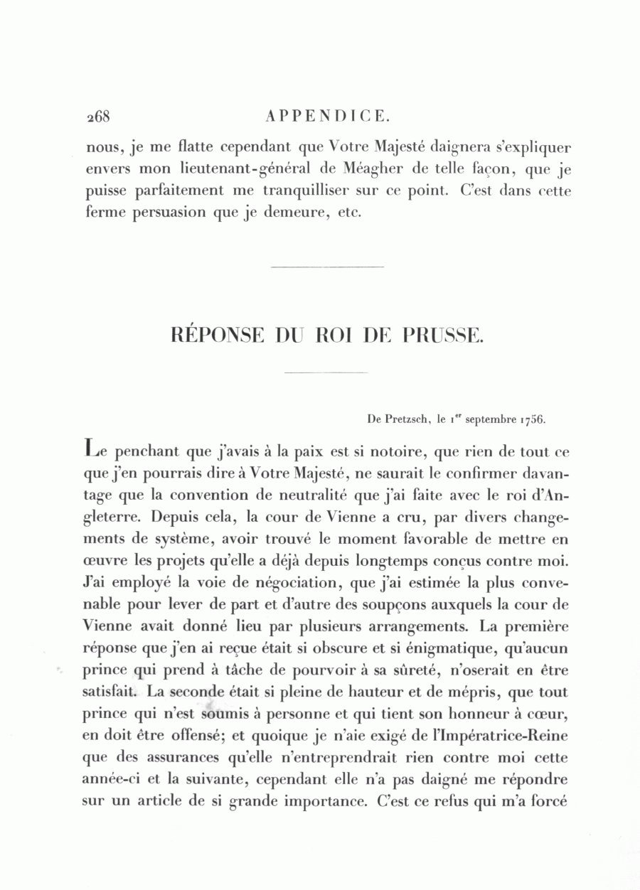 Le penchant que j'avais à la paix est si notoire, que rien de tout ce que j'en pourrais dire à Votre Majesté, ne saurait le confirmer davantage que la convention de neutralité que j'ai faite avec le roi d'Angleterre. Depuis cela, la cour de Vienne a cru, par divers changements de système, avoir trouvé le moment favorable de mettre en œuvre les projets qu'elle a déjà depuis longtemps conçus contre moi. J'ai employé la voie de négociation, que j'ai estimée la plus convenable pour lever de part et d'autre des soupçons auxquels la cour de Vienne avait donné lieu par plusieurs arrangements. La première réponse que j'en ai reçue était si obscure et si énigmatique, qu'aucun prince qui prend à tâche de pourvoir à sa sûreté, n'oserait en être satisfait. La seconde était si pleine de hauteur et de mépris, que tout prince qui n'est soumis à personne et qui tient son honneur à cœur, en doit être offensé; et quoique je n'aie exigé de l'Impératrice-Reine que des assurances qu'elle n'entreprendrait rien contre moi cette année-ci et la suivante, cependant elle n'a pas daigné me répondre sur un article de si grande importance. C'est ce refus qui m'a forcé