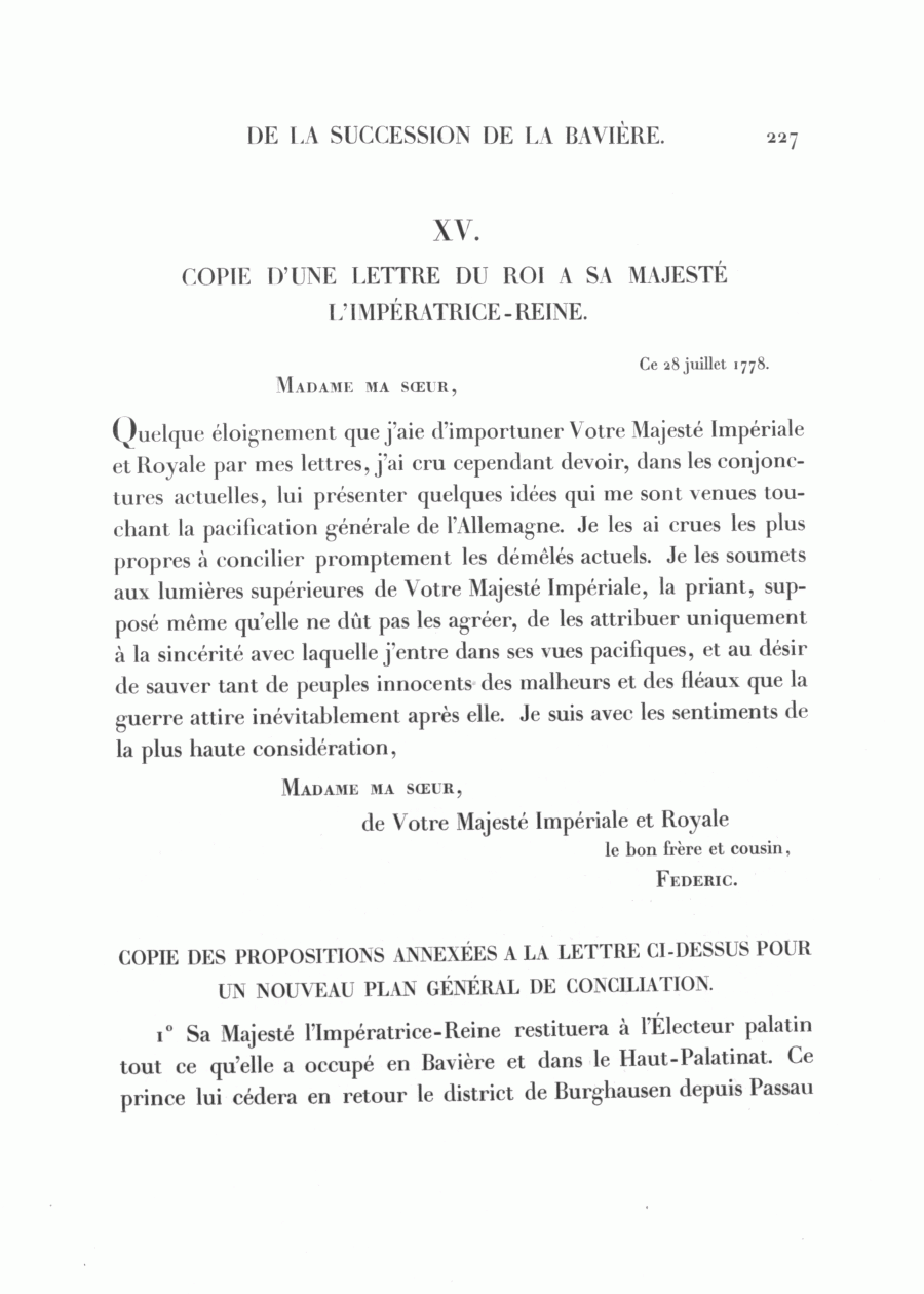 Quelque éloignement que j'aie d'importuner Votre Majesté Impériale et Royale par mes lettres, j'ai cru cependant devoir, dans les conjonctures actuelles, lui présenter quelques idées qui me sont venues touchant la pacification générale de l'Allemagne. Je les ai crues les plus propres à concilier promptement les démêlés actuels. Je les soumets aux lumières supérieures de Votre Majesté Impériale, la priant, supposé même qu'elle ne dût pas les agréer, de les attribuer uniquement à la sincérité avec laquelle j'entre dans ses vues pacifiques, et au désir de sauver tant de peuples innocents des malheurs et des fléaux que la guerre attire inévitablement après elle. Je suis avec les sentiments de la plus haute considération,