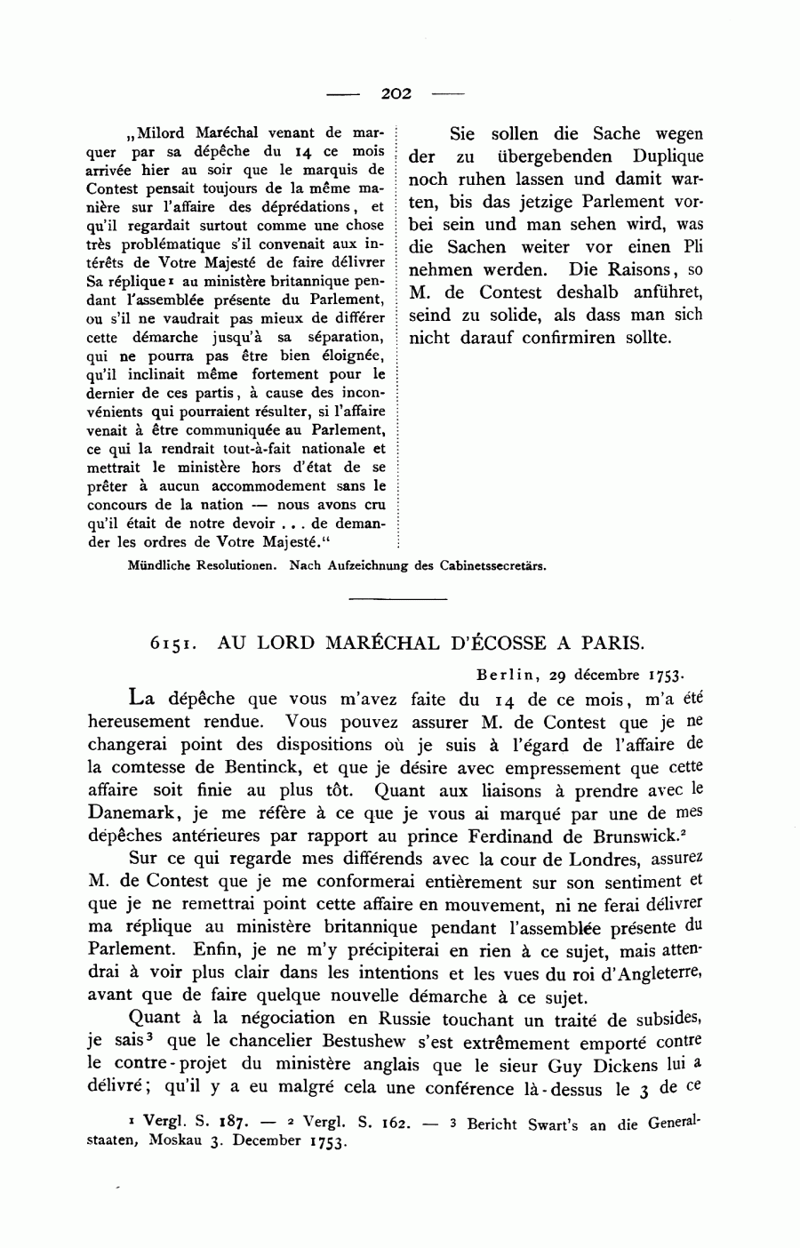 „Milord Maréchal venant de marquer par sa dépêche du 14 ce mois arrivée hier au soir que le marquis de Contest pensait toujours de la même manière sur l'affaire des déprédations, et qu'il regardait surtout comme une chose très problématique s'il convenait aux intérêts de Votre Majesté de faire délivrer Sa réplique1 au ministère britannique pendant l'assemblée présente du Parlement, ou s'il ne vaudrait pas mieux de différer cette démarche jusqu'à sa séparation, qui ne pourra pas être bien éloignée, qu'il inclinait même fortement pour le dernier de ces partis, à cause des inconvénients qui pourraient résulter, si l'affaire venait à être communiquée au Parlement, ce qui la rendrait tout-à-fait nationale et mettrait le ministère hors d'état de se prêter à aucun accommodement sans le concours de la nation — nous avons cru qu'il était de notre devoir … de demander les ordres de Votre Majesté.“