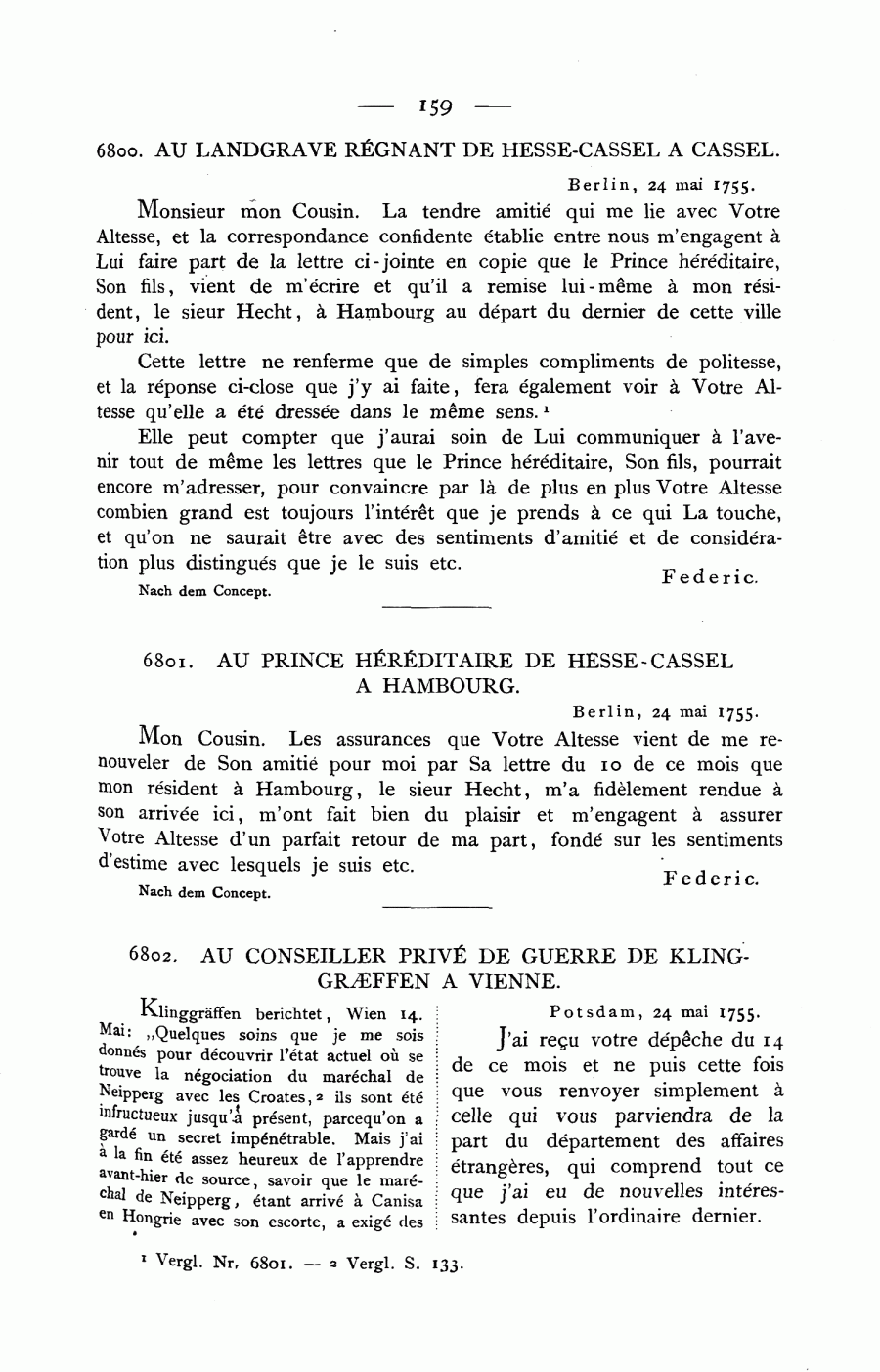 Klinggräffen berichtet, Wien 14. Mai: „Quelques soins que je me sois donnés pour découvrir l'état actuel où se trouve la négociation du maréchal de Neipperg avec les Croates,2 ils sont été infructueux jusqu'à présent, parcequ'on a gardé un secret impénétrable. Mais j'ai à la fin été assez heureux de l'apprendre avant-hier de source, savoir que le maréchal de Neipperg, étant arrivé à Canisa en Hongrie avec son escorte, a exigé des | Potsdam, 24 mai 1755. J'ai reçu votre dépêche du 14 de ce mois et ne puis cette fois que vous renvoyer simplement à celle qui vous parviendra de la part du département des affaires étrangères, qui comprend tout ce que j'ai eu de nouvelles intéressantes depuis l'ordinaire dernier. |